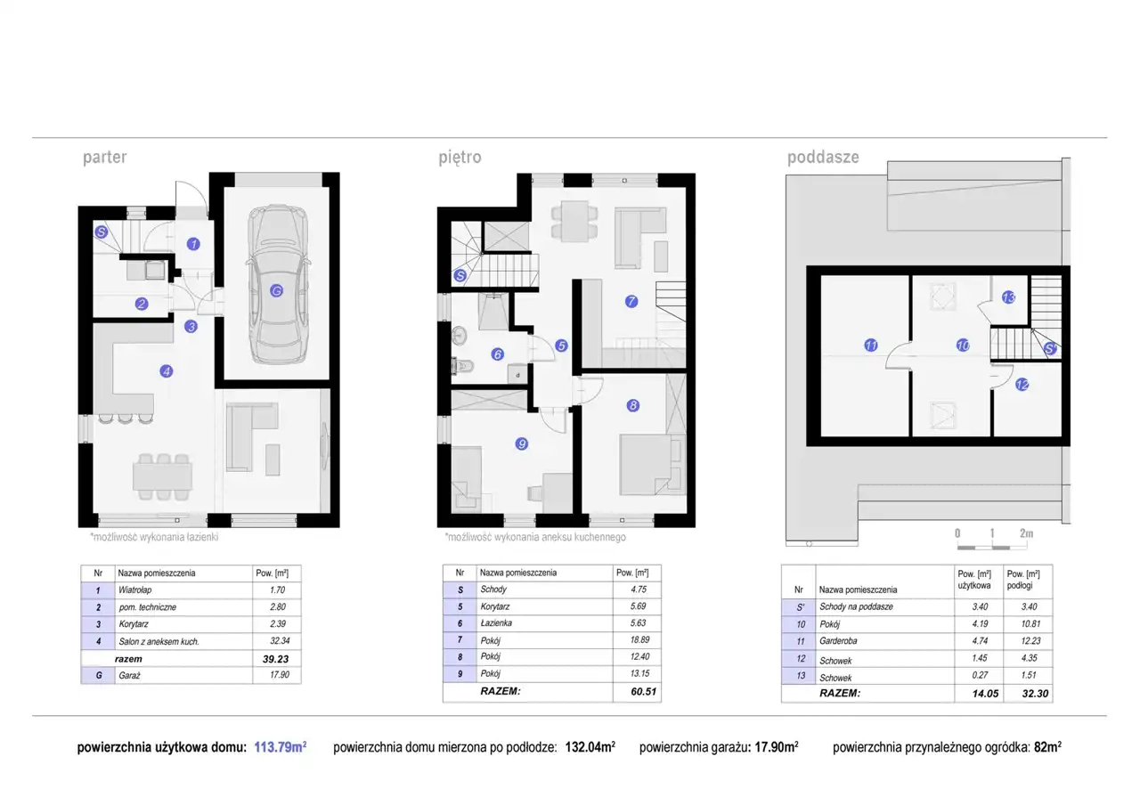Parter: wiatrołap (1,7m2), pom. techniczne (2,8m2), korytarz (2,339m2), salon z aneksem kuchennym (32,34m2), garaż (17,9m2) - razem 57,13m2