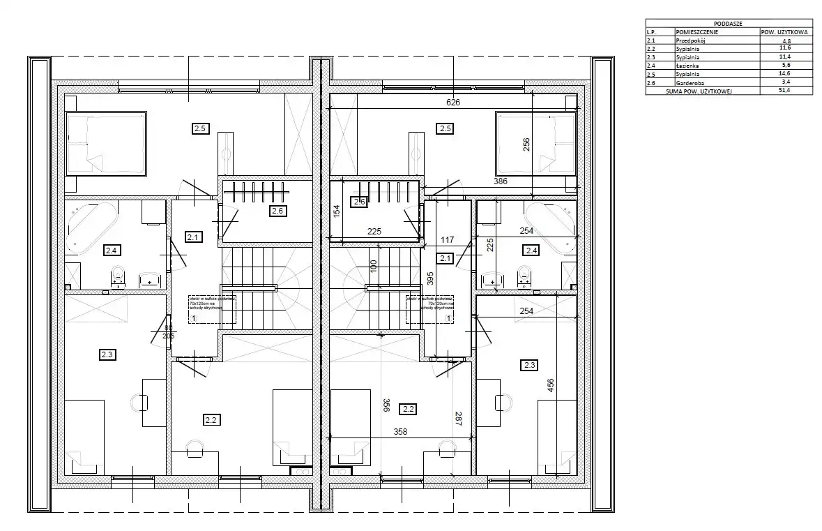 Poddasze: przedpokój (4,8m2), sypialnia (11,6m2), sypialnia (11,4m2), łazienka (5,6m2), sypialnia (14,6m2), garderoba (3,4m2) - razem 51,4m2