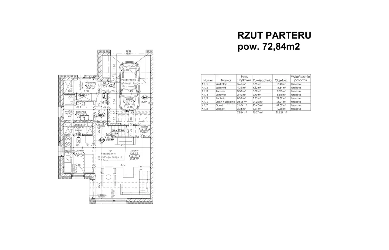 Parter: wiatrołap (5,65m2), łazienka (4,32m2), korytarz (3,50m2), schowek (2,4m2), kuchnia (8,35m2), salon + jadalnia (24,25m2), garaż (1,04m2), schody (3,34m2) - razem 72,84m2