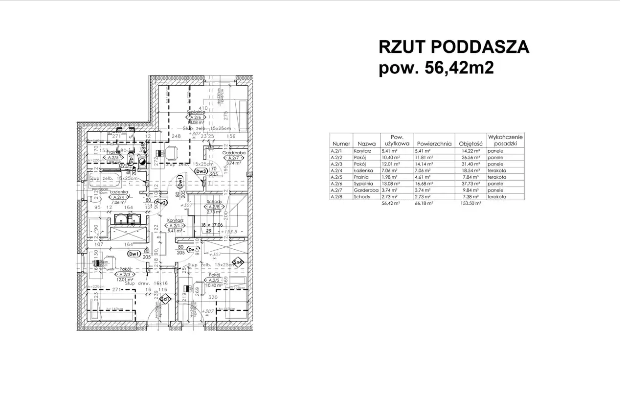 Poddasze: korytarz (5,41m2), pokój (10,4m2), pokój (12,01m2), łazienka (7,06m2), pralnia (1,98m2), sypialnia (13,08m2), garderoba (3,74m2), schody (2,73m2) - razem 56,42m2