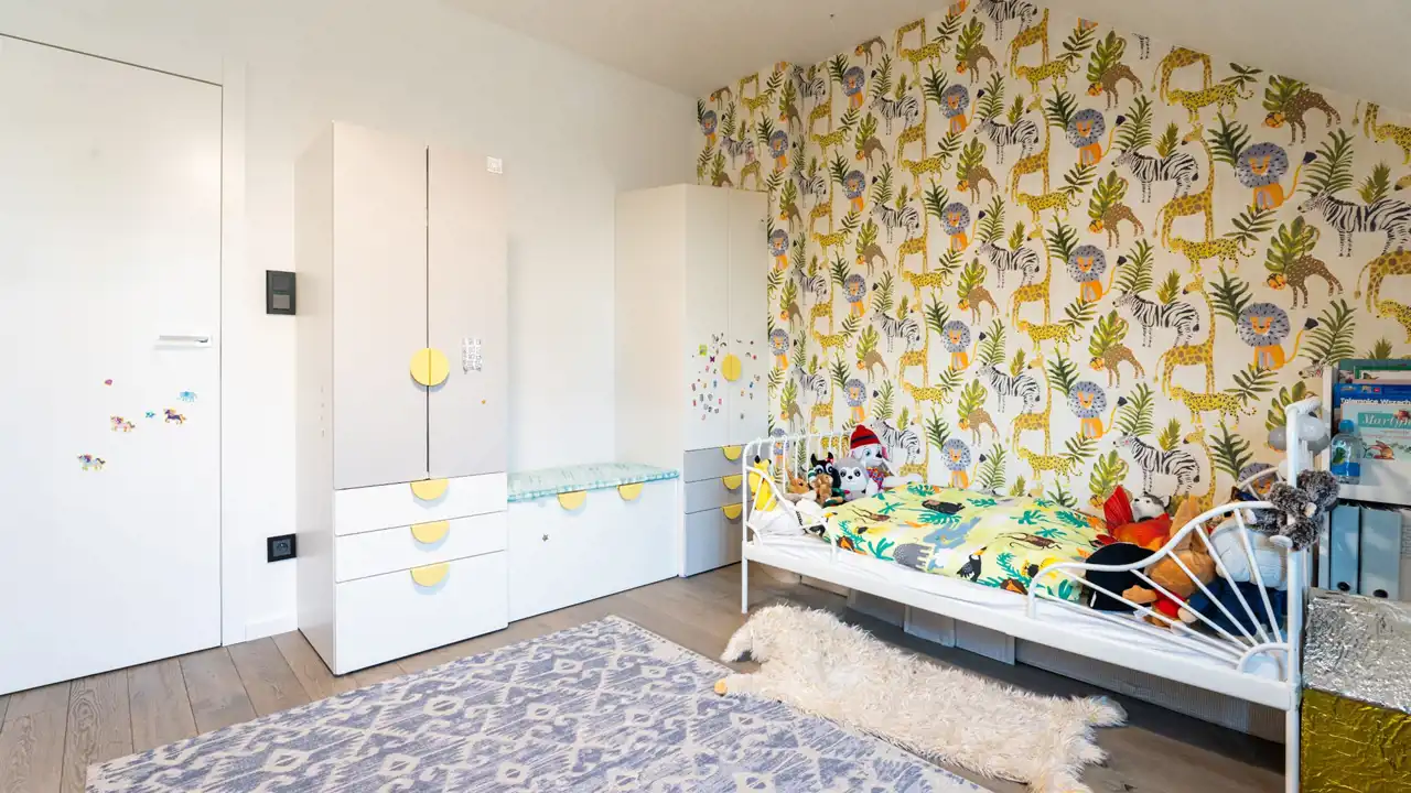 Na pierwszym piętrze znajduje się duża łazienka z oknem z wanną i prysznicem, dwie sypialnie dla dzieci oraz jedna większa sypialnia z wydzieloną garderobą typu walk in.