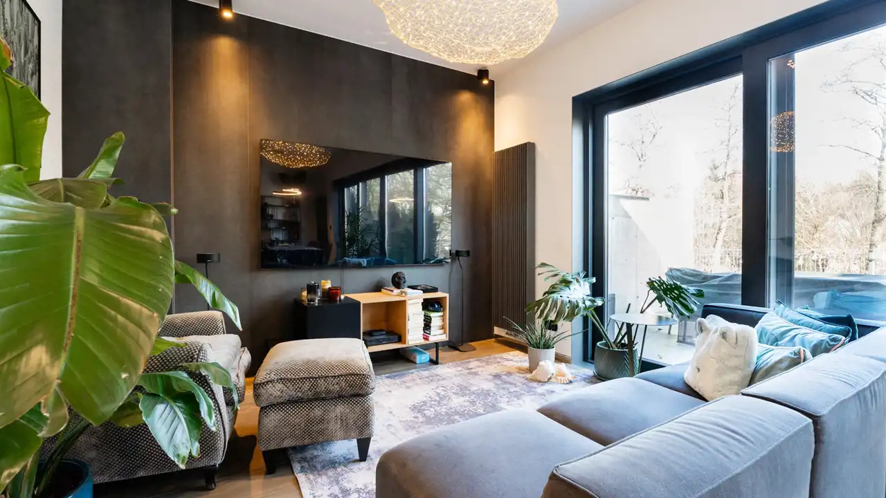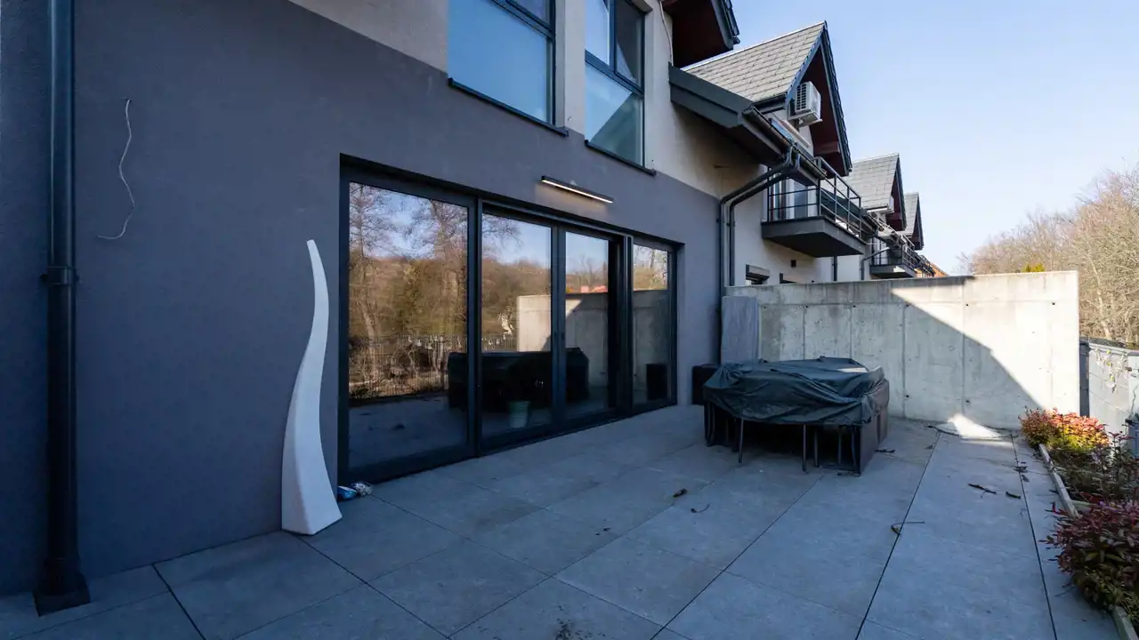 Salon ma dostęp do sporego, intymnego tarasu, wychodzącego na zieleń i graniczącego bezpośrednio z sąsiednią działką, atutem jest brak sąsiadów patrzących w okna.