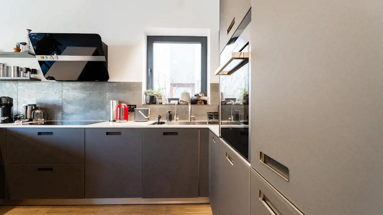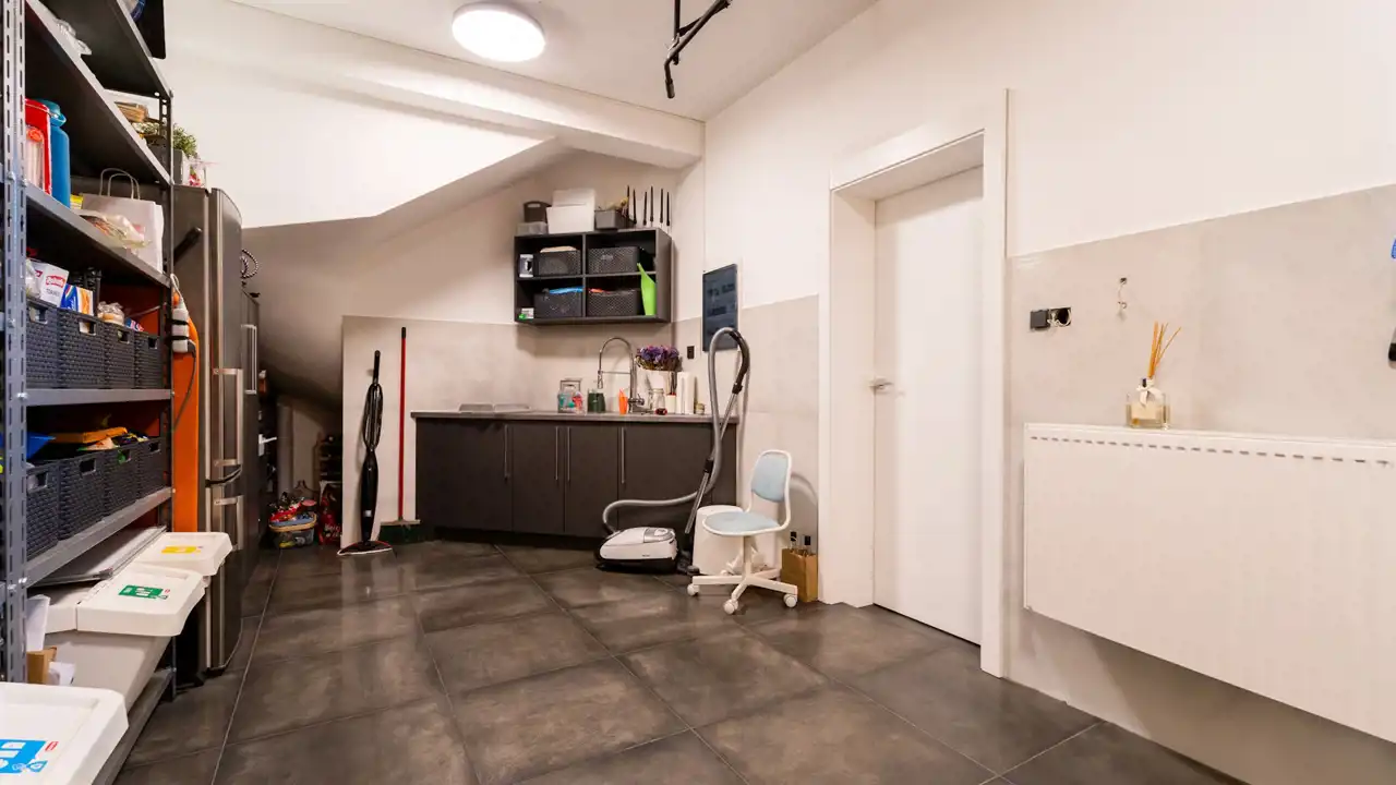 Duże pomieszczenie gospodarcze ma wejście zewnątrz budynku, może służyć do przechowywania rowerów, dodatkowo jest wyposażone w lodówki, zlew roboczy i zabudowę na sprzęty do rekreacji.