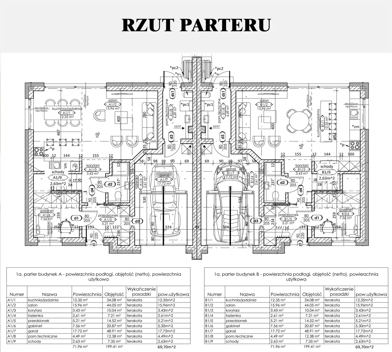 Parter: kuchnia/jadalnia (12,35m2), salon (15,96m2), korytarz (3,43m2), łazienka (2,61m2), przedsionek (5,21m2), gabinet (5,3m2), garaż (17,72m2), pom. techniczne (4,49m2), schody (2,63m2) - razem 69,7m2
