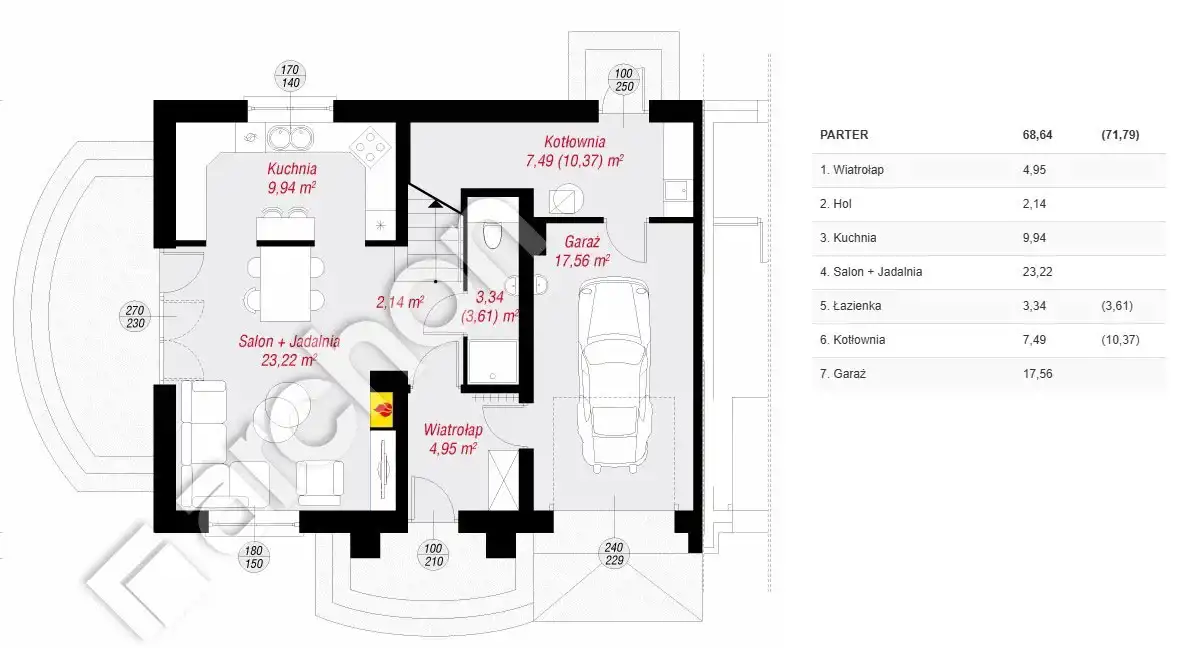 - Parter: wiatrołap (4,95m2), hol (2,14m2), kuchnia (9,94m2), salon + jadalnia (23,22m2), łazienka (3,34m2), kotłownia (7,49m2), garaż (17,56m2) - razem 68,64m2
