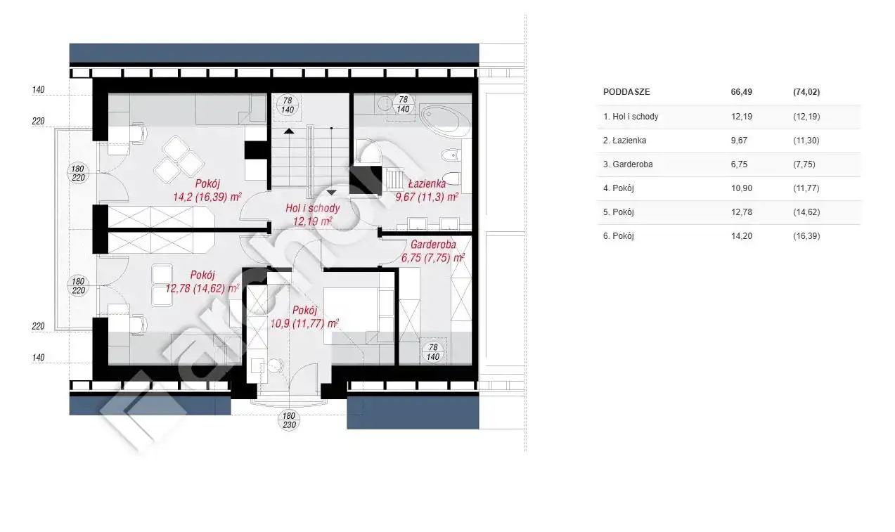 - Piętro: hol i schody (12,19m2), łazienka (9,67m2), garderoba (6,75m2), pokój (10,9m2), pokój (12,78m2), pokój (14,2m2) - razem 66,49m2