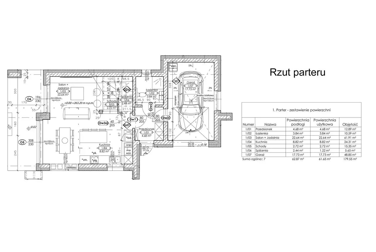 Parter: przedsionek (4,68m2), łazienka (3,84m2), salon + jadalnia (22,64m2), kuchnia (8,82m2), schody (2,72m2), spiżarnia (1,22m2), garaż (17,73m2) - razem 61,65m2