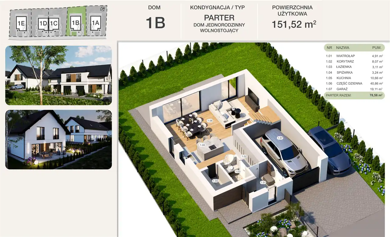 Parter: wiatrołap (4,91m2), korytarz (8,07m2), łazienka (3,11m2), spiżarka (3,24m2), kuchnia (10,66m2), część dzienna (40,86m2), garaż (19,11m2) - razem 78,58m2
