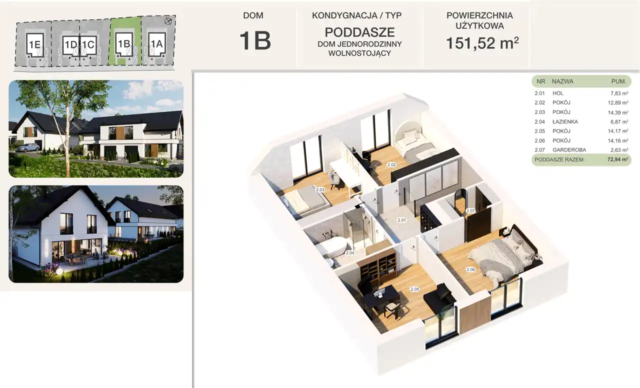 Poddasze: hol (7,83m2), pokój (12,89m2), pokój (14,39m2), łazienka (6,87m2), pokój (14,17), pokój (14,16m2), garderoba (2,63m2) - razem 72,94m2