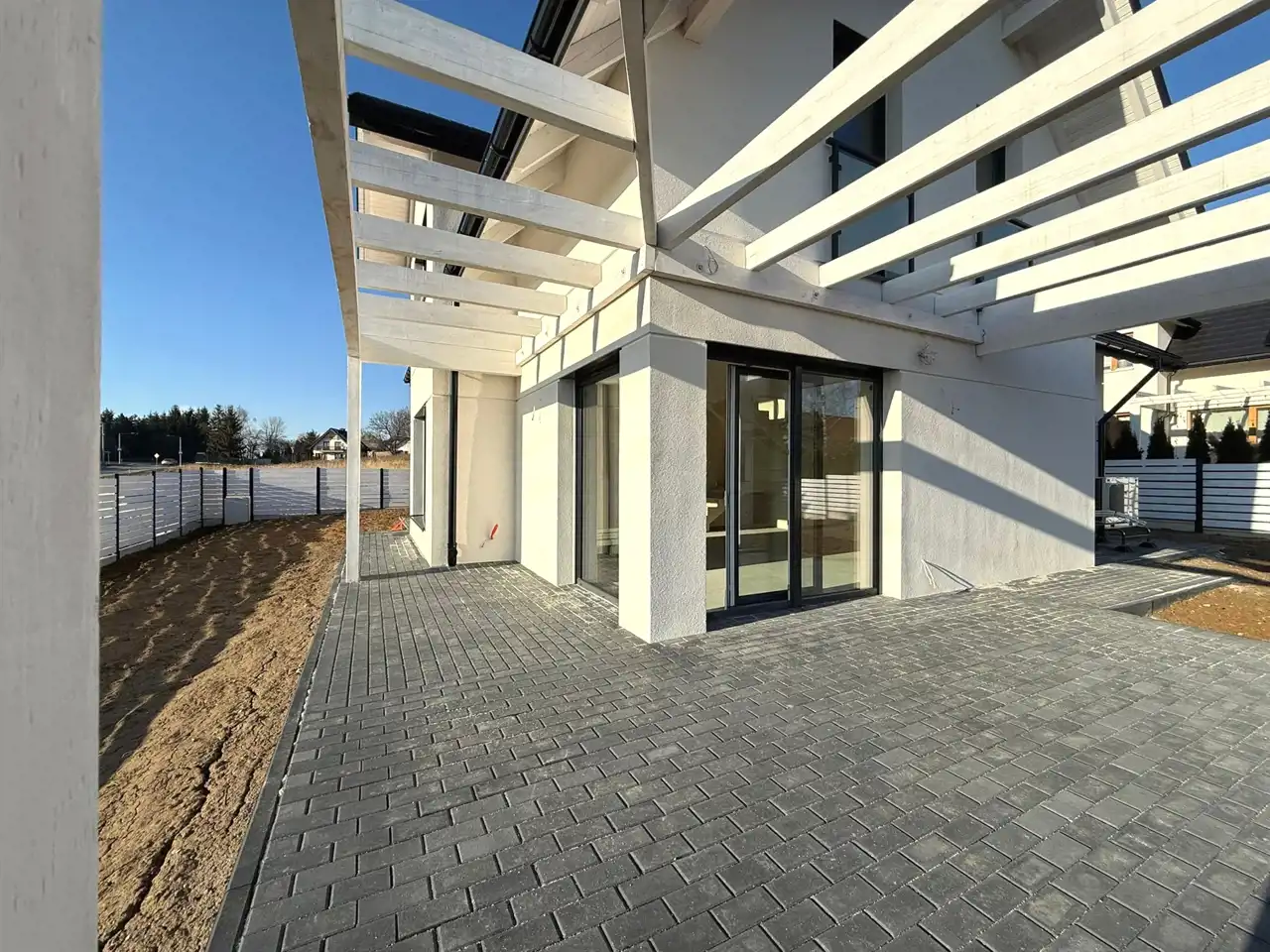 Budynek z przynależnymi: balkonem, tarasem, garażem w bryle, dwoma miejscami postojowymi, trzema sypialniami oraz dwiema łazienkami.
