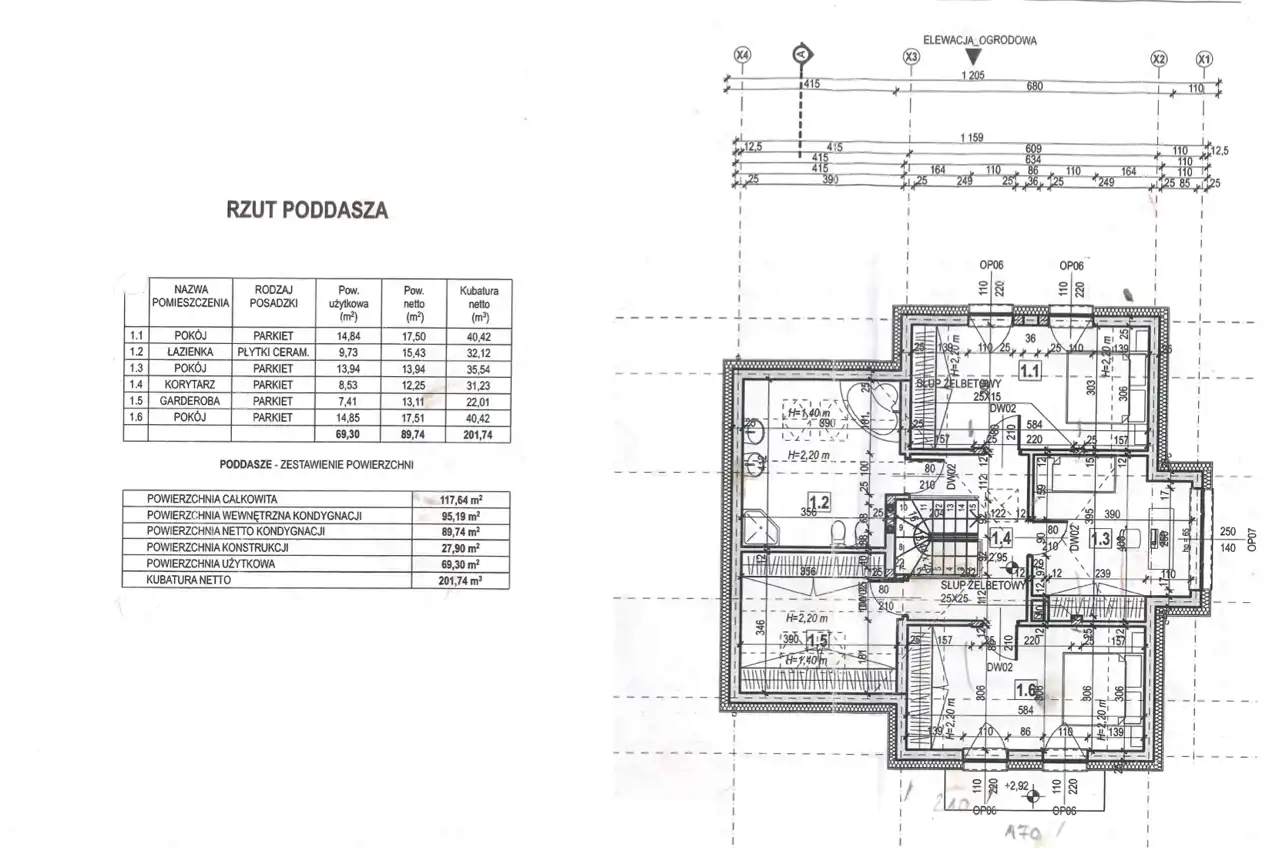 - poddasze: pokój (14,84m2), łazienka (9,73m2), pokój (13,94m2), korytarz (8,53m2), garderoba (7,41m2), pokój (14,85m2) - razem 69,13m2