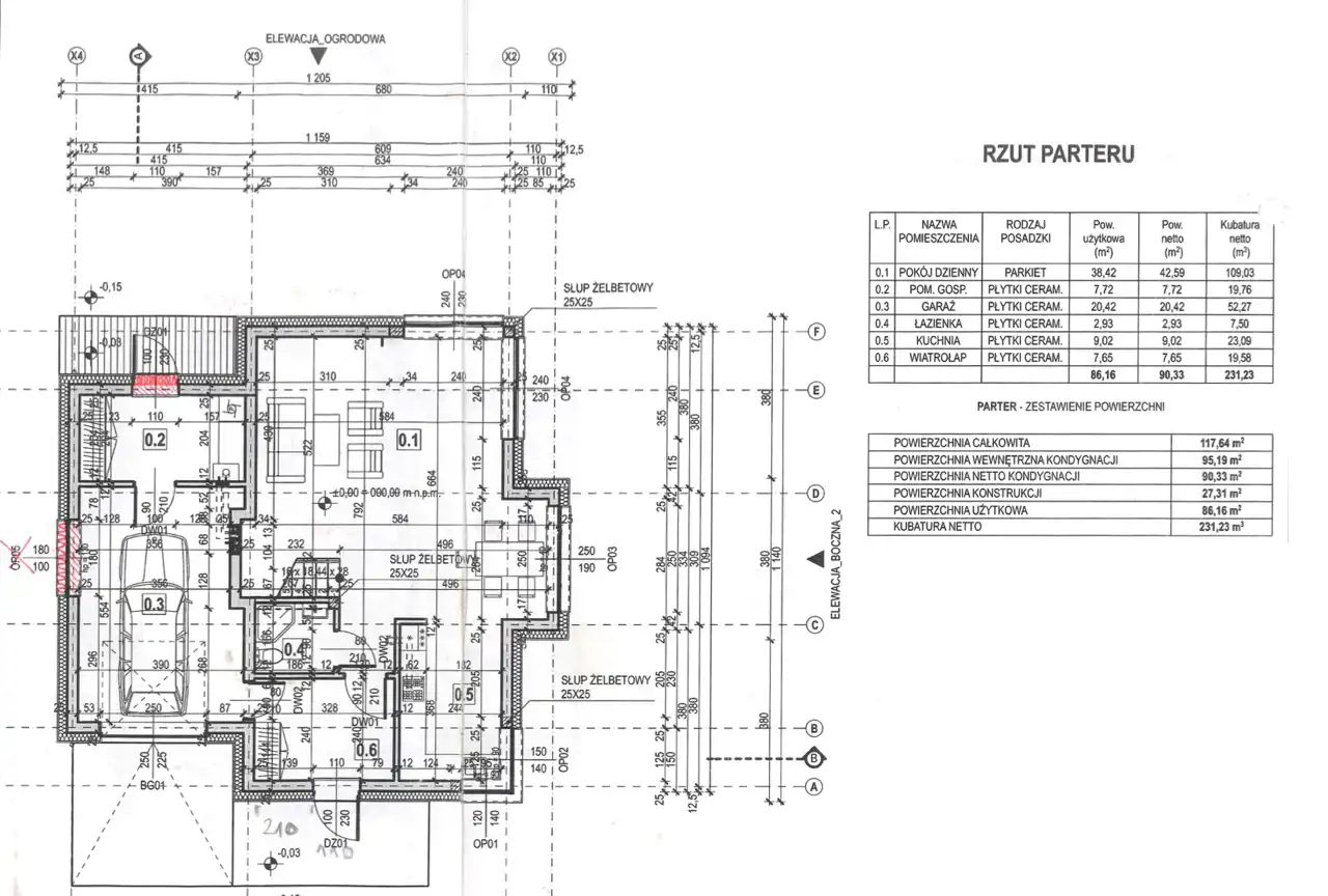 - parter: wiatrołap (7,65m2), pom. gospodarcze (7,72m2), garaż (20,42m2), pokój dzienny (38,42m2), łazienka (2,93m2), kuchnia (9,02m2) - razem 86,16m2