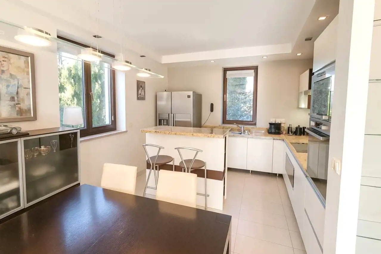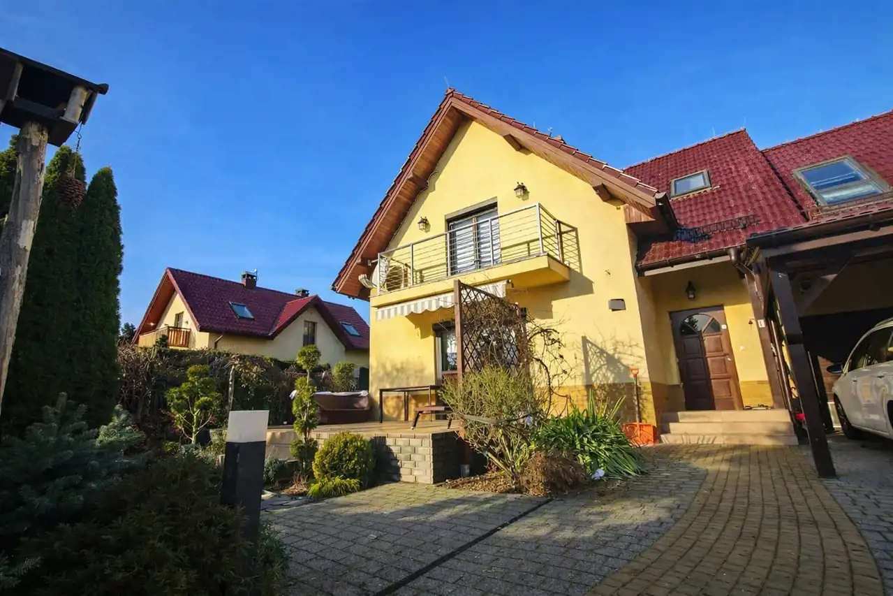 Do sprzedania atrakcyjny dom jednorodzinny w zabudowie bliźniaczej zlokalizowany na pograniczu Bibic i Zielonek tuż przy granicy Krakowa. Dom o pow. ok. 199m2 położony na płaskiej, ogrodzonej i ładnie zagospodarowanej działce o pow. 4,51 ara. Działka w kształcie prostokąta o wym. 16m/ 28m, dojazd do nieruchomości drogą gminną asfaltową, następnie drogą prywatną (kostka brukowa). Dom zadbany, wykończony i urządzony w najwyższym standardzie - nie wymaga wkładu własnego. Budynek z przynależnym garażem ulokowanym w bryle, przestronnym salonem, balkonem, tarasem oraz ogrodem zimowym. Przed domem wiata samochodowa.