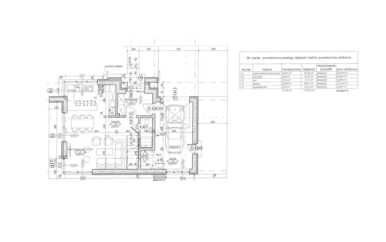 Parter: salon/jadalnia/kuchnia (32,02m2), korytarz (4,04m2), WC (2,69m2), garaż (19,61m2), przedsionek (5,69m2) - razem 64,05m2