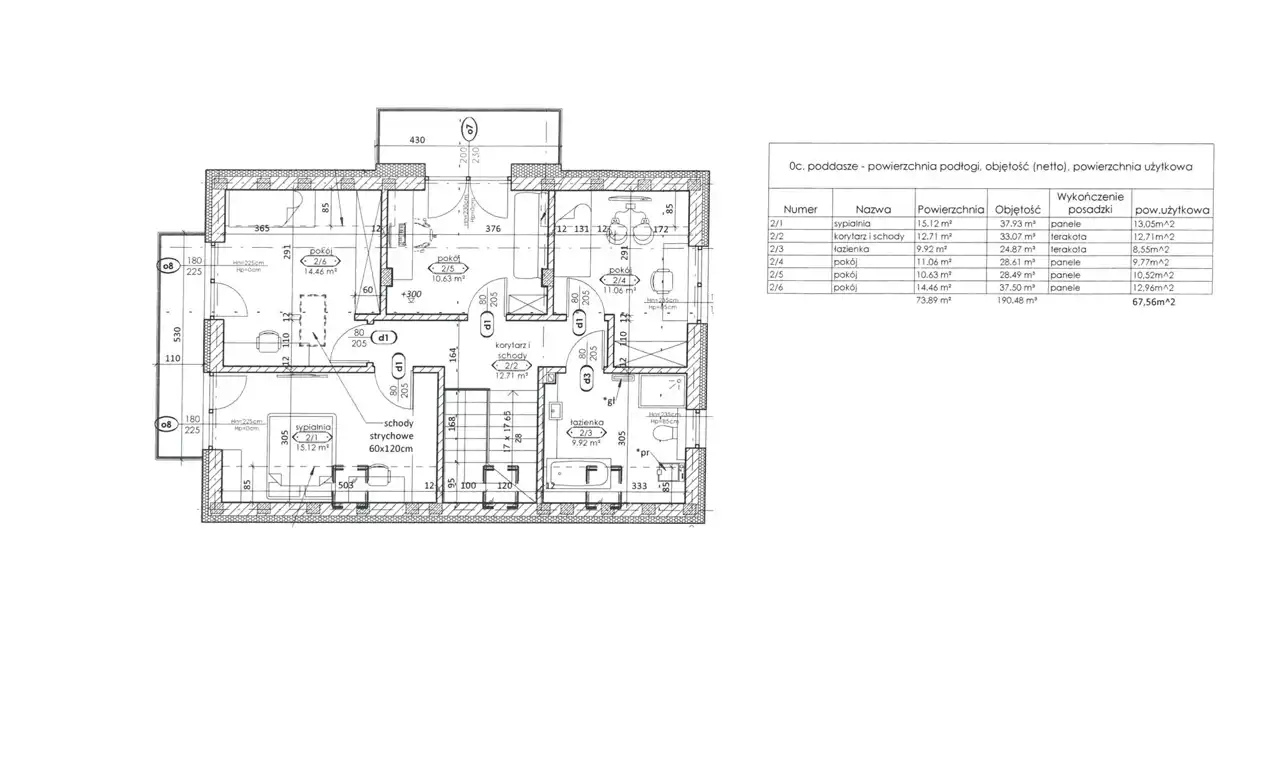 Poddasze: sypialnia (13,05m2), korytarz (12,71m2), łazienka (8,55m2), pokój (9,77m2), pokój (10,52m2), pokój (12,69m2) - razem 67,56m2