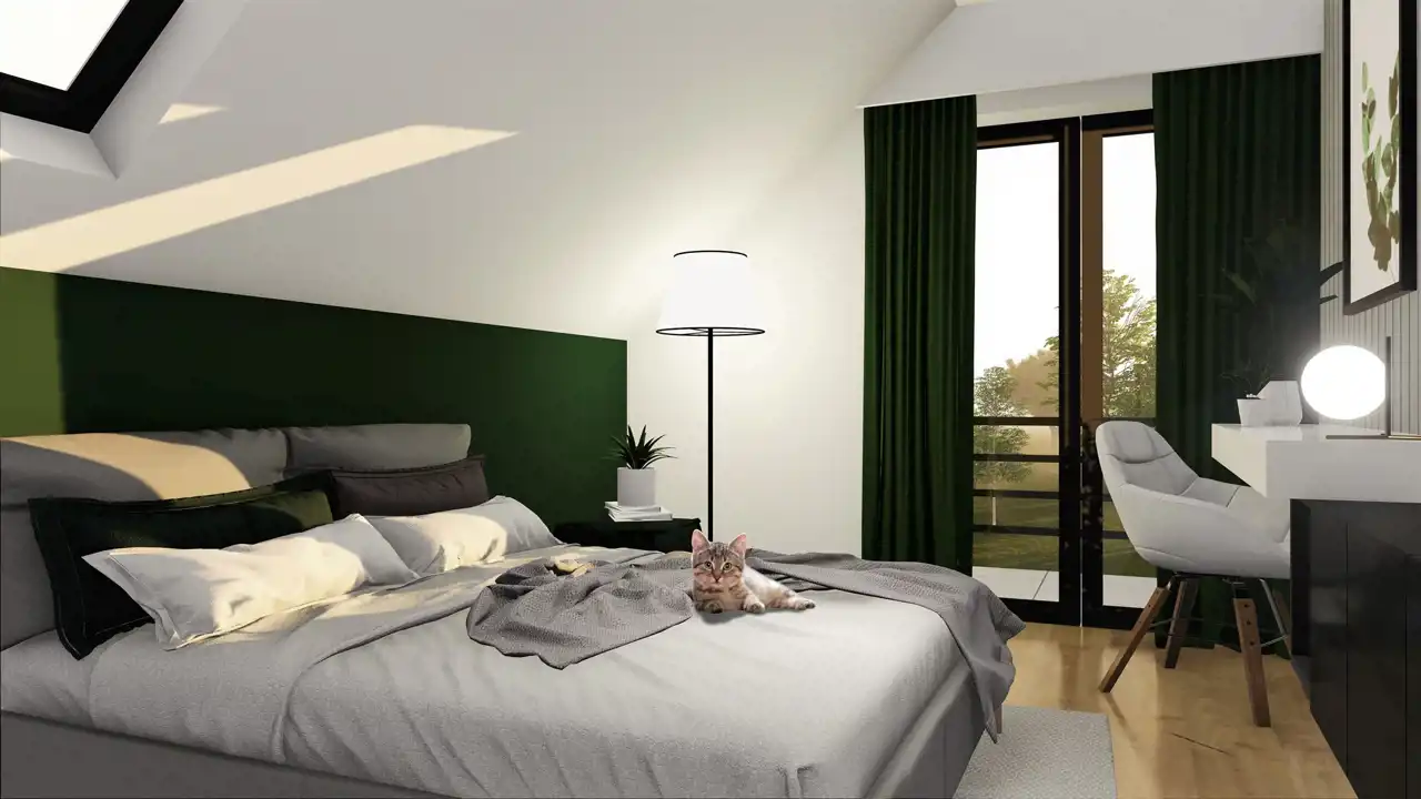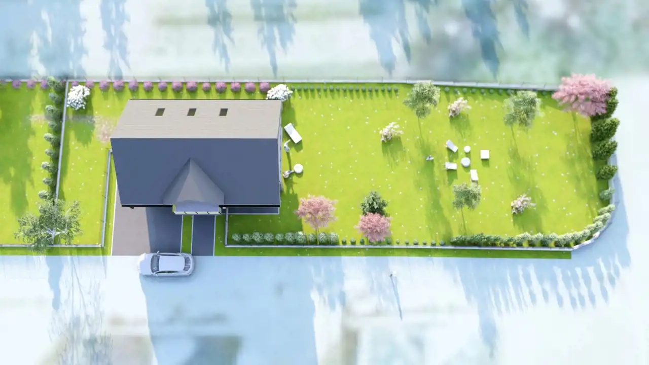 Budynek z przynależnymi: garażem ulokowanym w bryle, dwoma balkonami oraz czterema sypialniami. Budynek nowoczesny z funkcjonalnym rozkładem pomieszczeń.