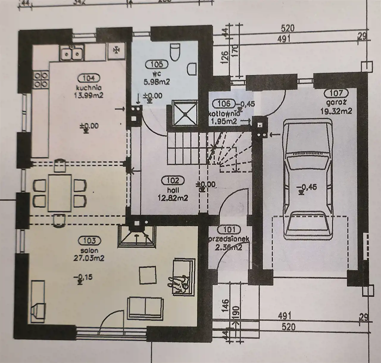 Parter: przedsionek (2,31m2), hall (14,32m2), kotłownia (2,09m2), łazienka (5,84m2), kuchnia (14,16m2), salon (26,13m2), ogród zimowy (ok. 12m2), garaż (18,43m2), pralnia + pom. gospodarcze (ok. 20m2)