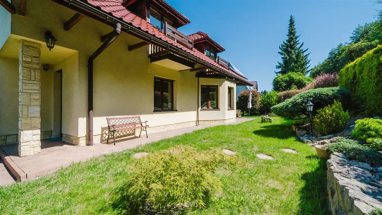Od strony północnej częściowo pochylona o spadku ok. 8%, zagospodarowana od północy dodatkowym garażem oraz wspaniałymi nasadzeniami. Od strony południowej podziwiać możemy zadbany, zielony ogród z dostępem z tarasu.