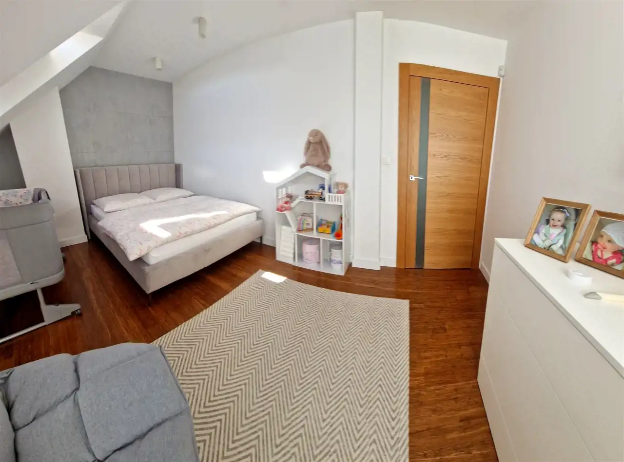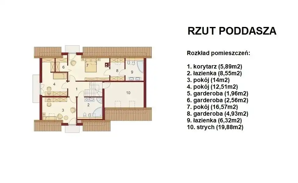 - poddasze: korytarz (5,89m2), łazienka (8,55m2), pokój (14m2), pokój (14,47m2), garderoba (2,56m2), pokój (16,57m2), garderoba (4,93m2), łazienka (6,32m2) + strych (19,88m2)