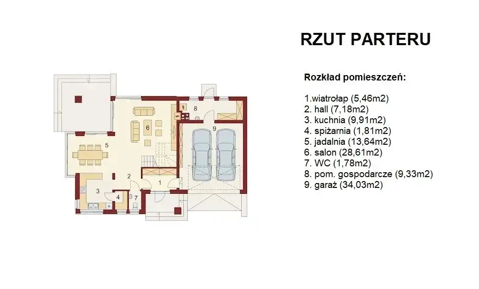 - parter: wiatrołap (5,46m2), hall (7,18m2), kuchnia (9,91m2), spiżarnia (1,81m2), jadalnia (13,64m2), salon (28,61m2), WC (1,78m2) + pom. gospodarcze (9,33m2) + garaż (34,03m2),