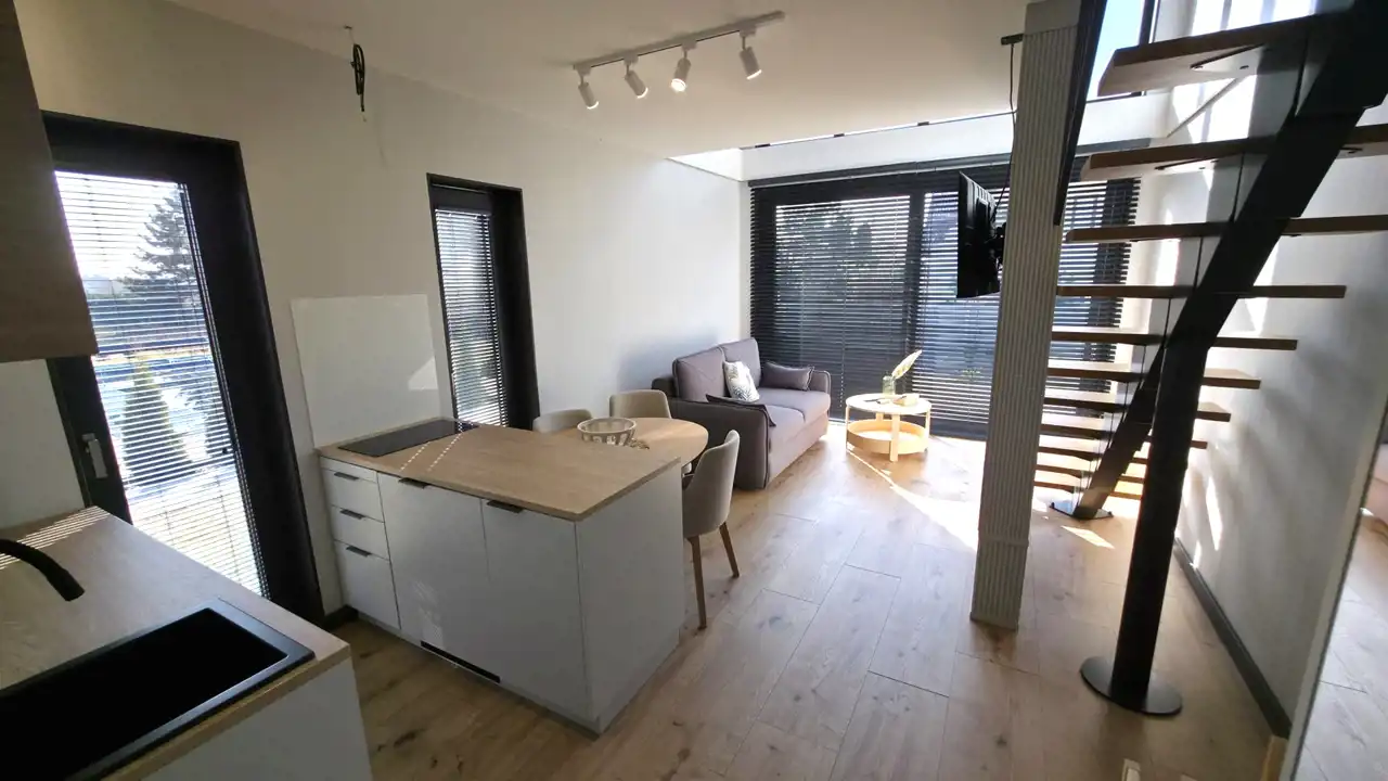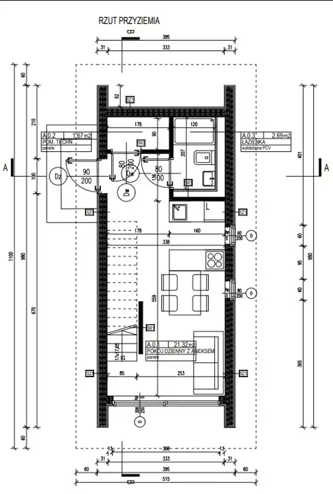 Przyziemie: pokój dzienny z aneksem (21,32m2), łazienka (2,69m2), pom. techniczne (1,67m2) - razem 25,68m2