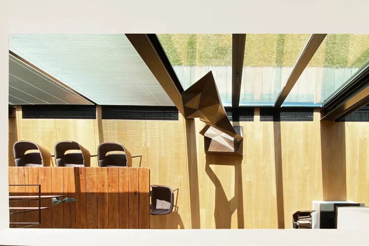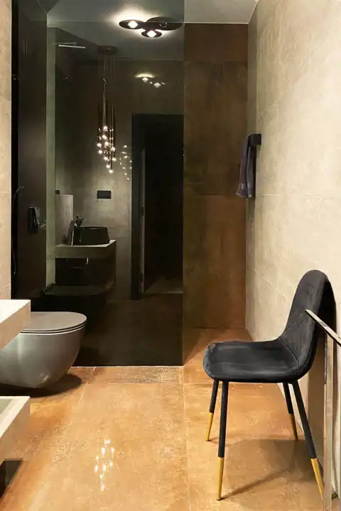 - wysoka jakość wykończenia – podłogi z dębu, schody i fragmenty ścian wykończone mikrocementem oraz spiekiem dekoracyjnym, ślusarka aluminiowa typu ciepłego wykonana na zamówienie, zewnętrzne balustrady szklane,
