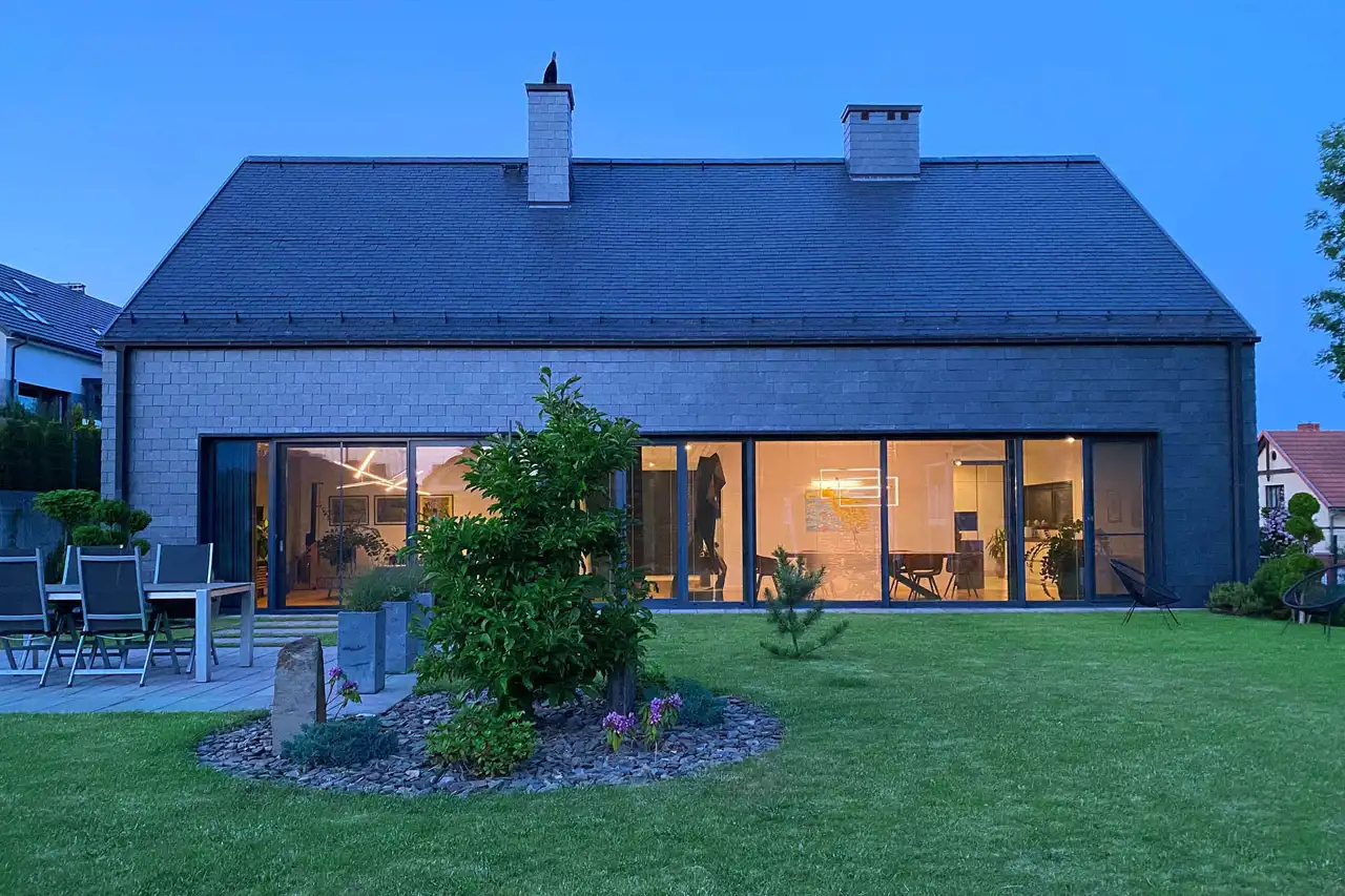 - dach + elewacja: w całości naturalny łupek firmy RATHSCHECK Schiefer (podwójne krycie prostokątne, kolor ciemnoszary) – trwałość i spektakularny wygląd.