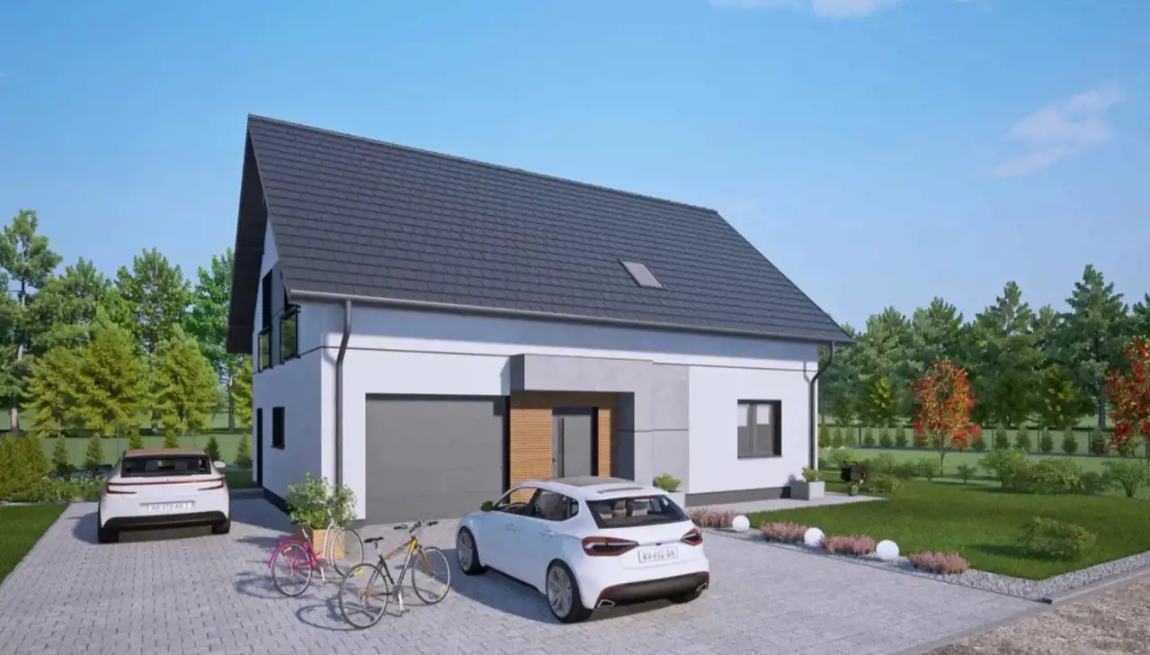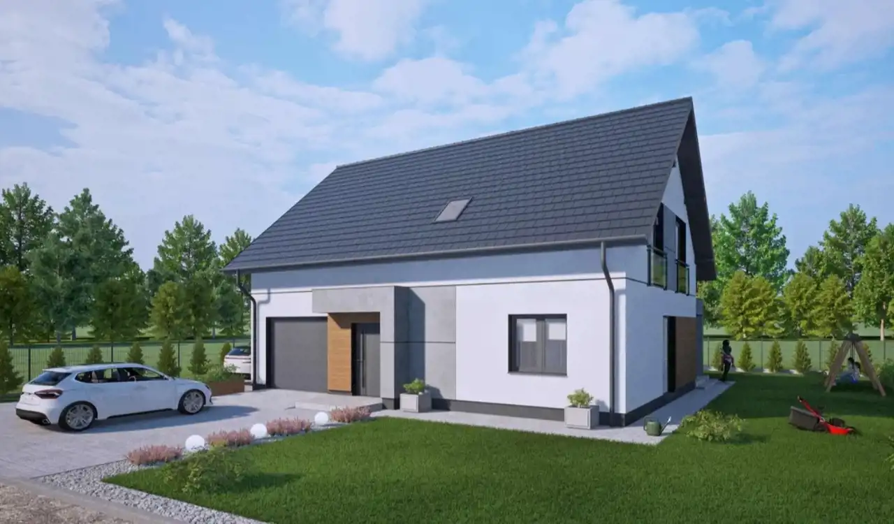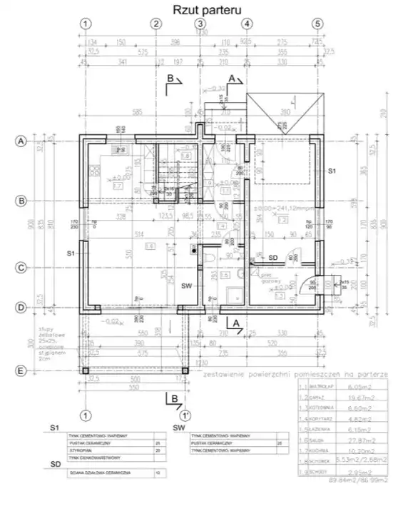 Parter: wiatrołap (6,05m2), garaż (19,67m2), kotłownia (6,6m2), korytarz (4,82m2), łazienka (6,15m2), salon (27,87m2), kuchnia (10,2m2), schowek (2,68m2), schody (2,95m2) - razem 86,99m2