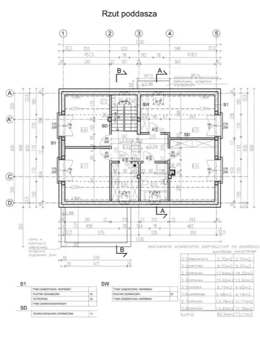Poddasze: komunikacja (2,7m2), korytarz (9,37m2), sypialnia (14,32m2), sypialnia (13,9m2), łazienka (4,92m2), garderoba (4,74m2), sypialnia (11,77m2), sypialnia (11,39m2) - razem 73,11m2
