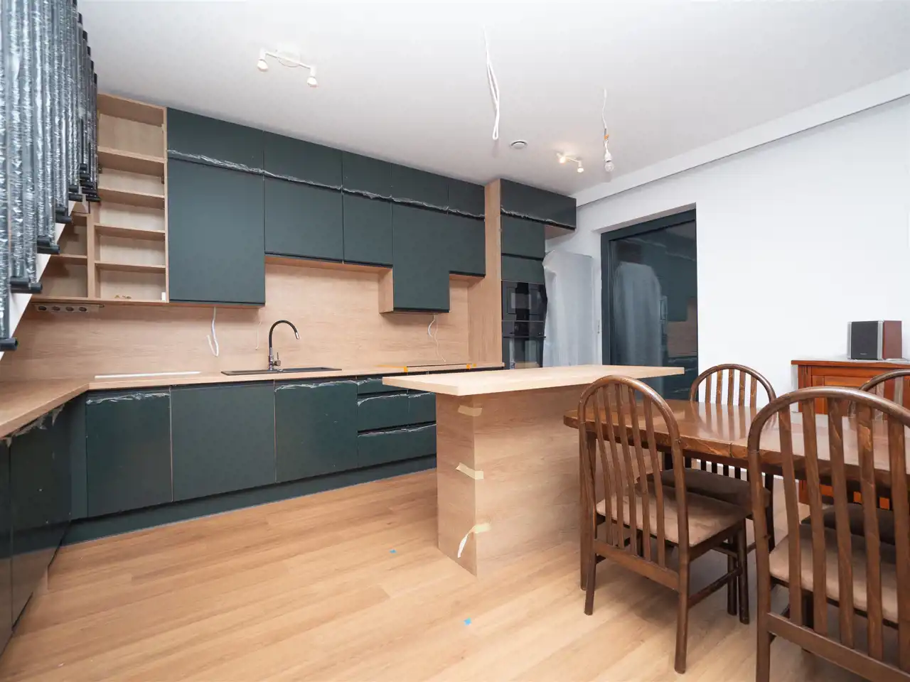 - salon z aneksem kuchennym i jadalnią (duża lodówka, zmywarka, płyta indukcyjna, mikrofala, piekarnik, duży blat roboczy)