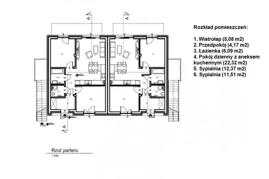 - wiatrołap (5,08m2), przedpokój (4,17m2), łazienka (6,09m2), pokój dzienny z aneksem kuchennym (22,32m2), sypialnia (12,37m2), sypialnia (11,51m2).