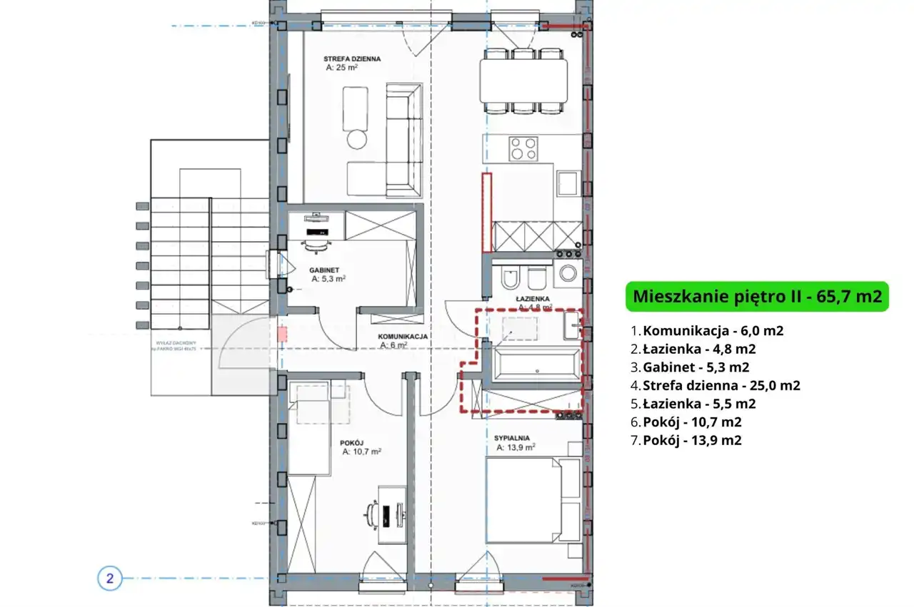 komunikacja (6m2), łazienka (4,8m2), gabinet (5,3m2), strefa dzienna (25m2), łazienka (5,5m2), pokój (10,7m2), pokój (13,9m2) - razem 65,7m2