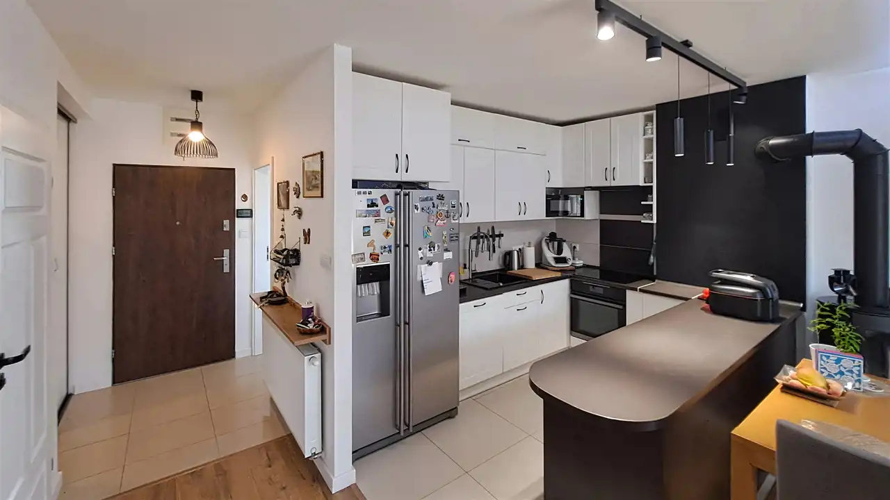 - Hall i kuchnia z praktyczną zabudową stolarską.