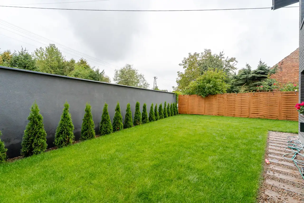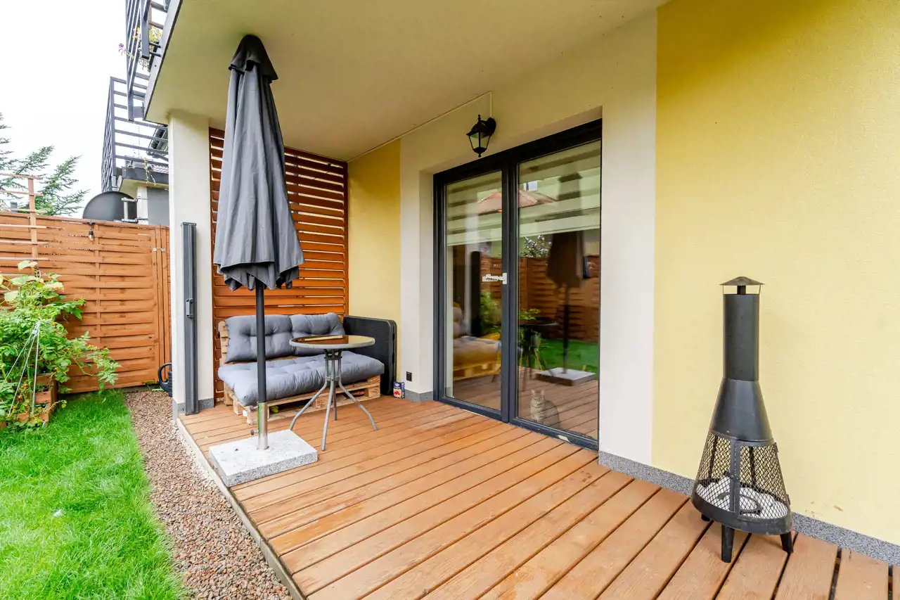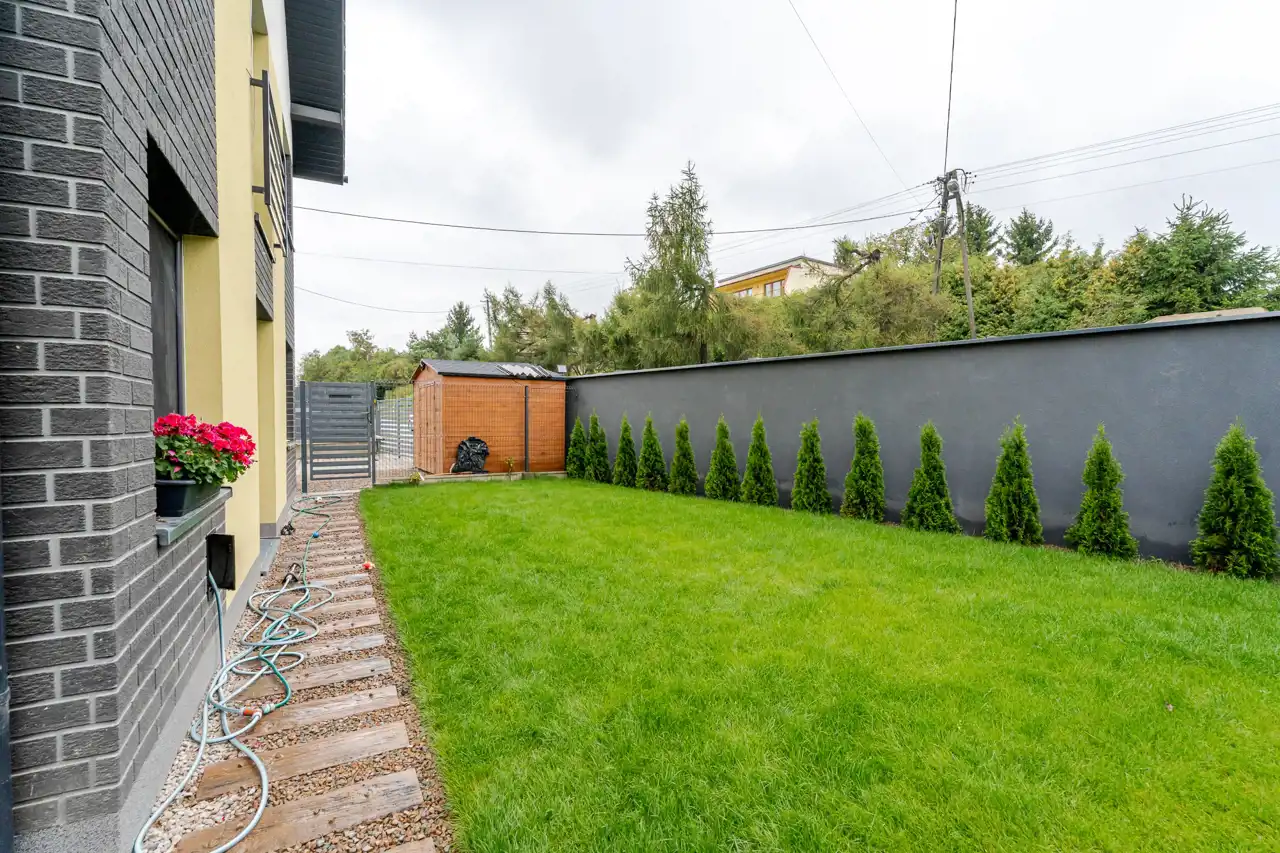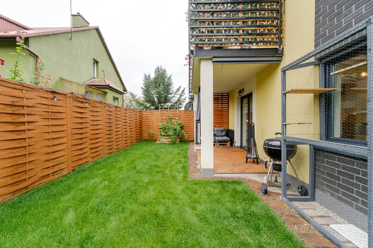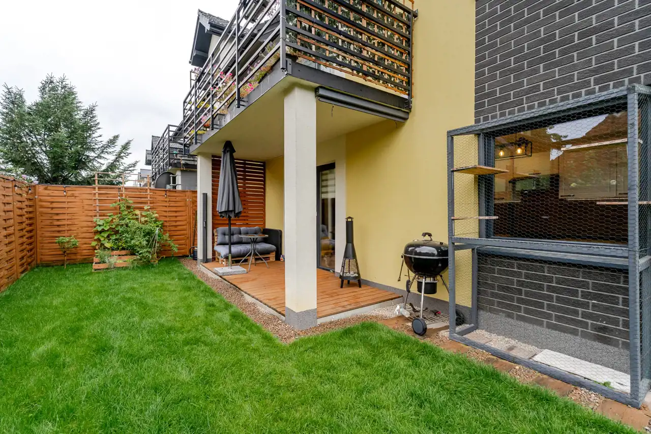 własny ogród (ok. 100 m²) z tarasem i kilkoma wyjściami (z salonu, sypialni oraz bezpośrednio z podjazdu)