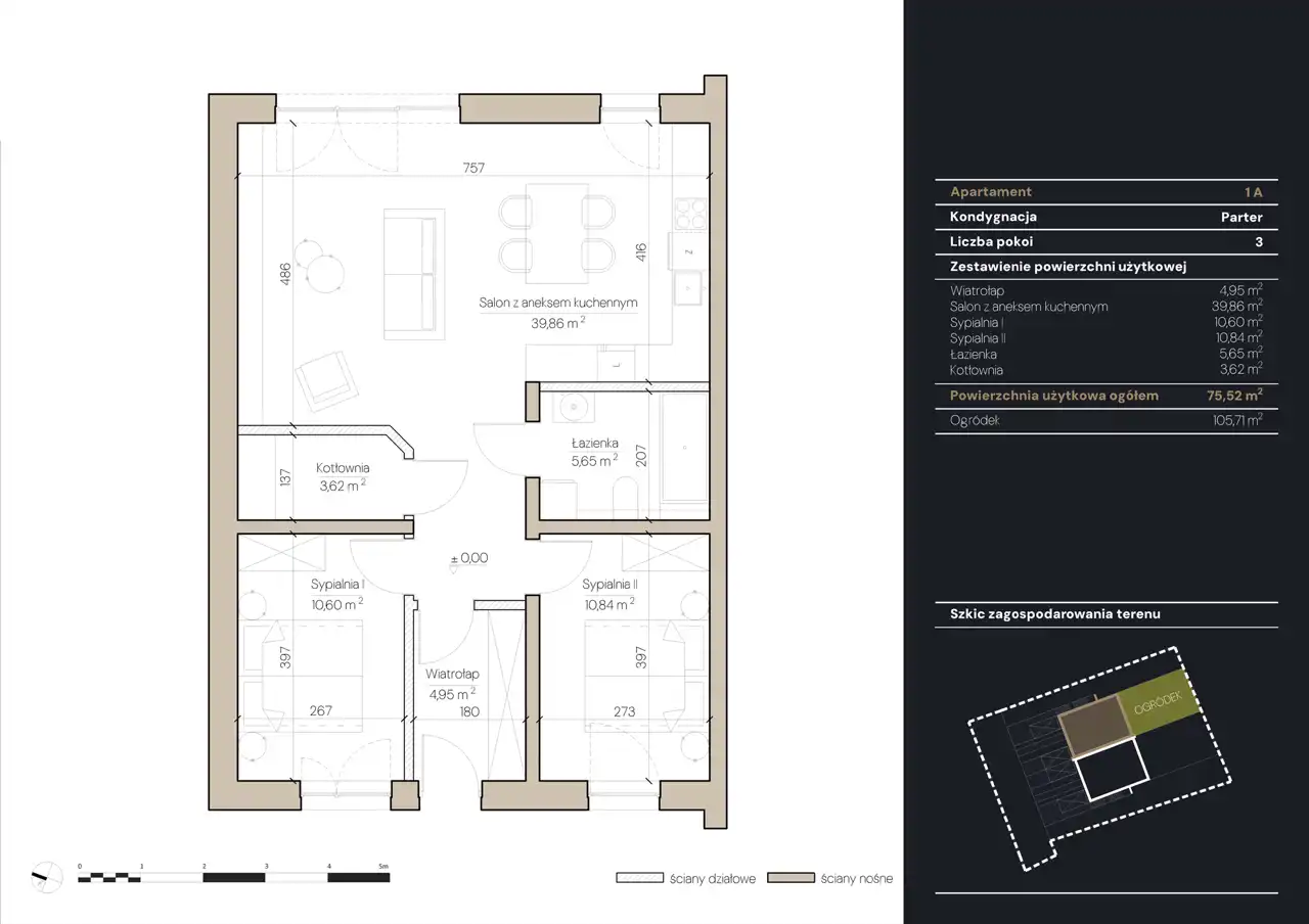 wiatrołap (4,95m2), sypialnia (10,60m2), sypialnia (10,84m2), kotłownia (3,62), łazienka (5,65m2), salon z aneksem kuchennym (39,86m2).