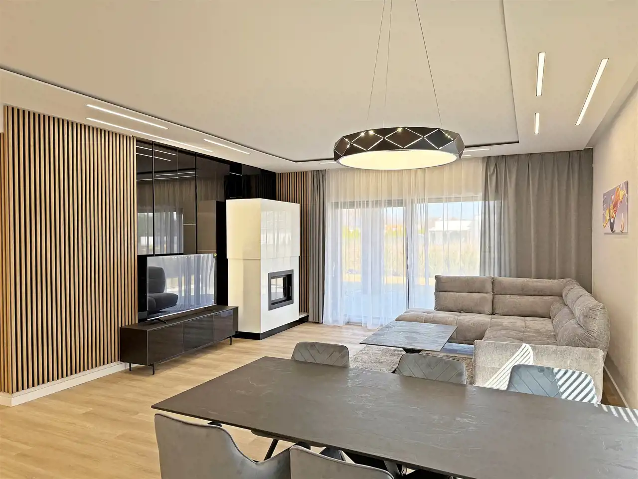 Salon: ściany – gładzie i tynk dekoracyjny, podłoga – panele