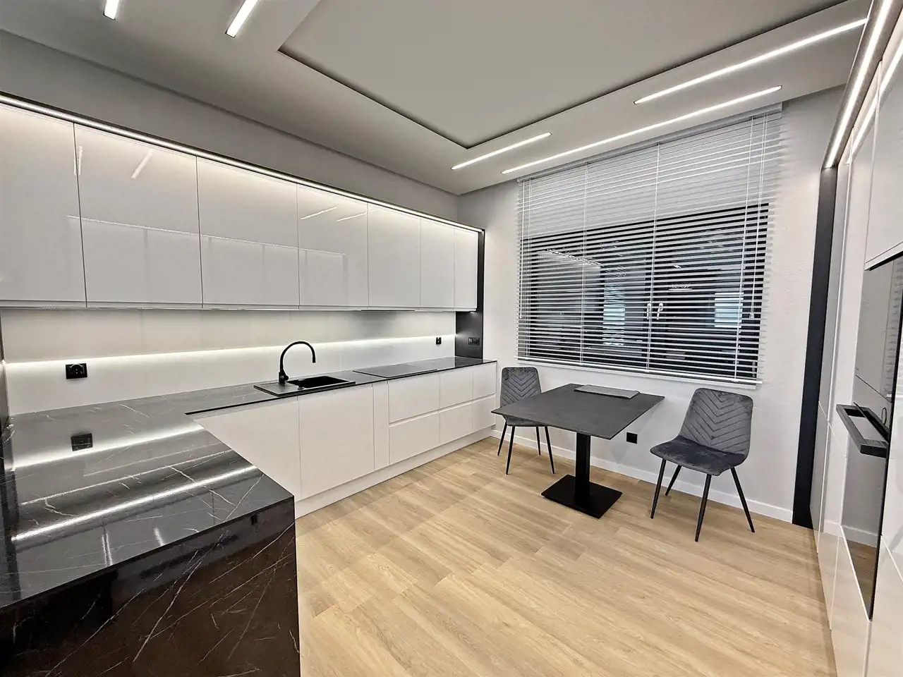 Kuchnia wykonana pod wymiar ze sprzętem agd w zabudowie.
