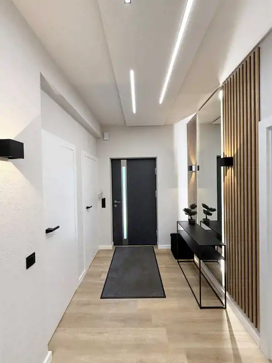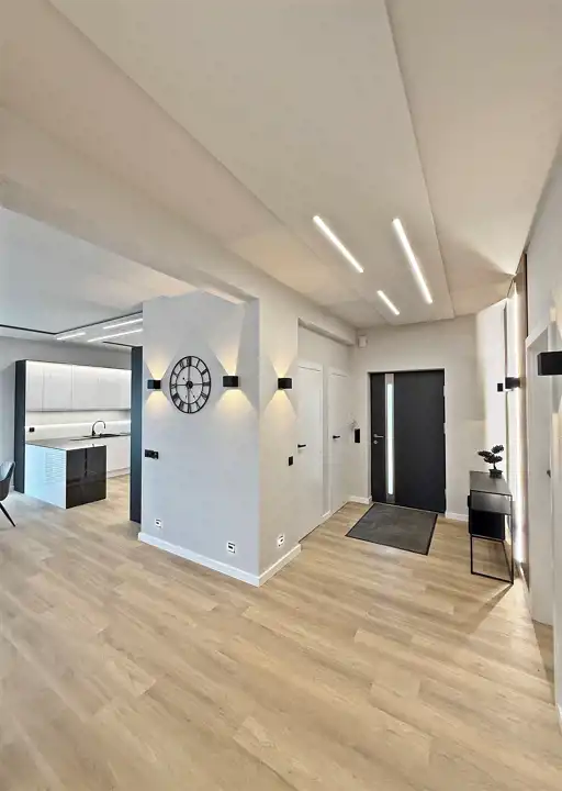 Hall: ściany – tynk dekoracyjny, podłoga – panele
