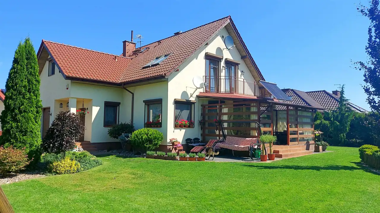 Na dachu domu dachówka ceramiczna, na dachu pomieszczenia gospodarczo- garażowego zamontowane PANELE FOTOWOLTAICZNE , dom oraz pomieszczenie gospodarcze osobne liczniki , wg starych zasad / PRĄD -PRAKTYCZNIE ZA DARMO /, na balkonie solary.
