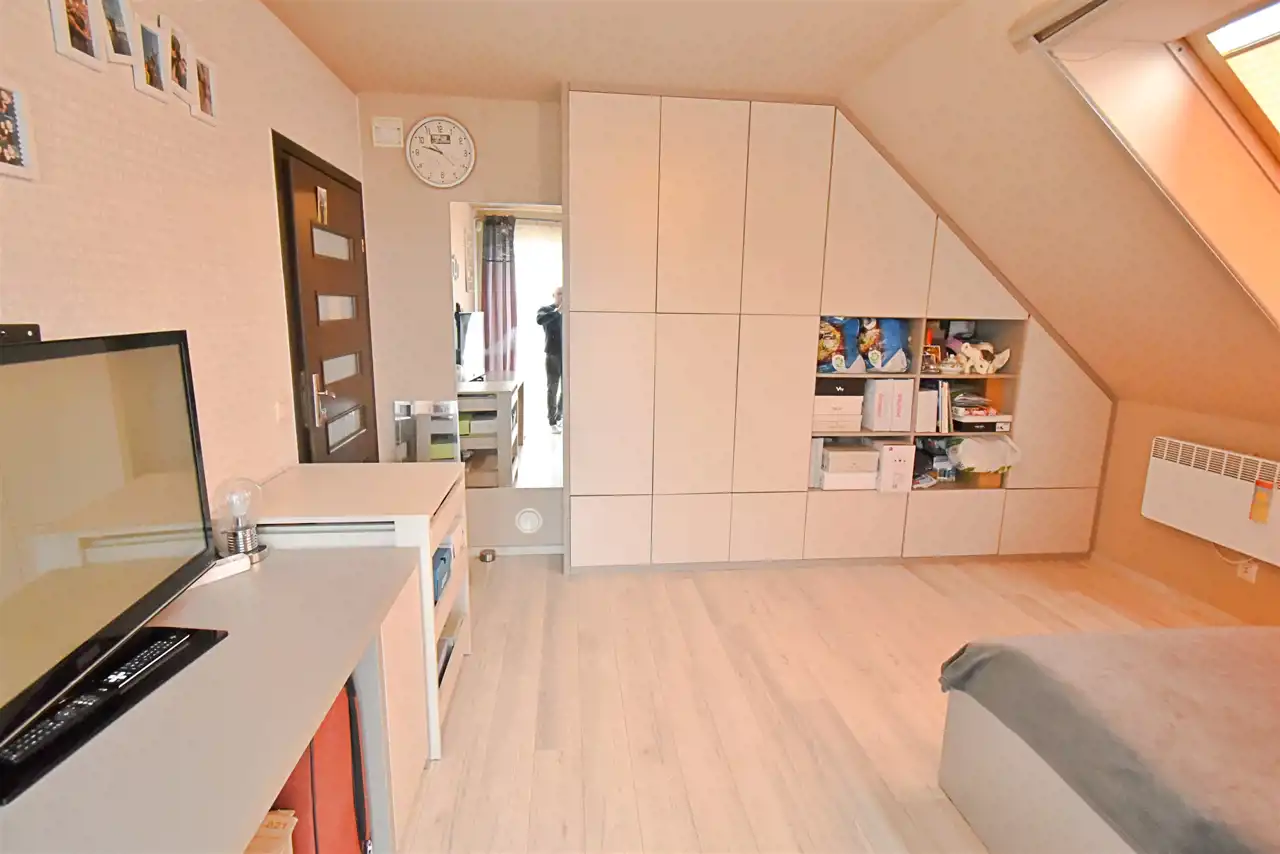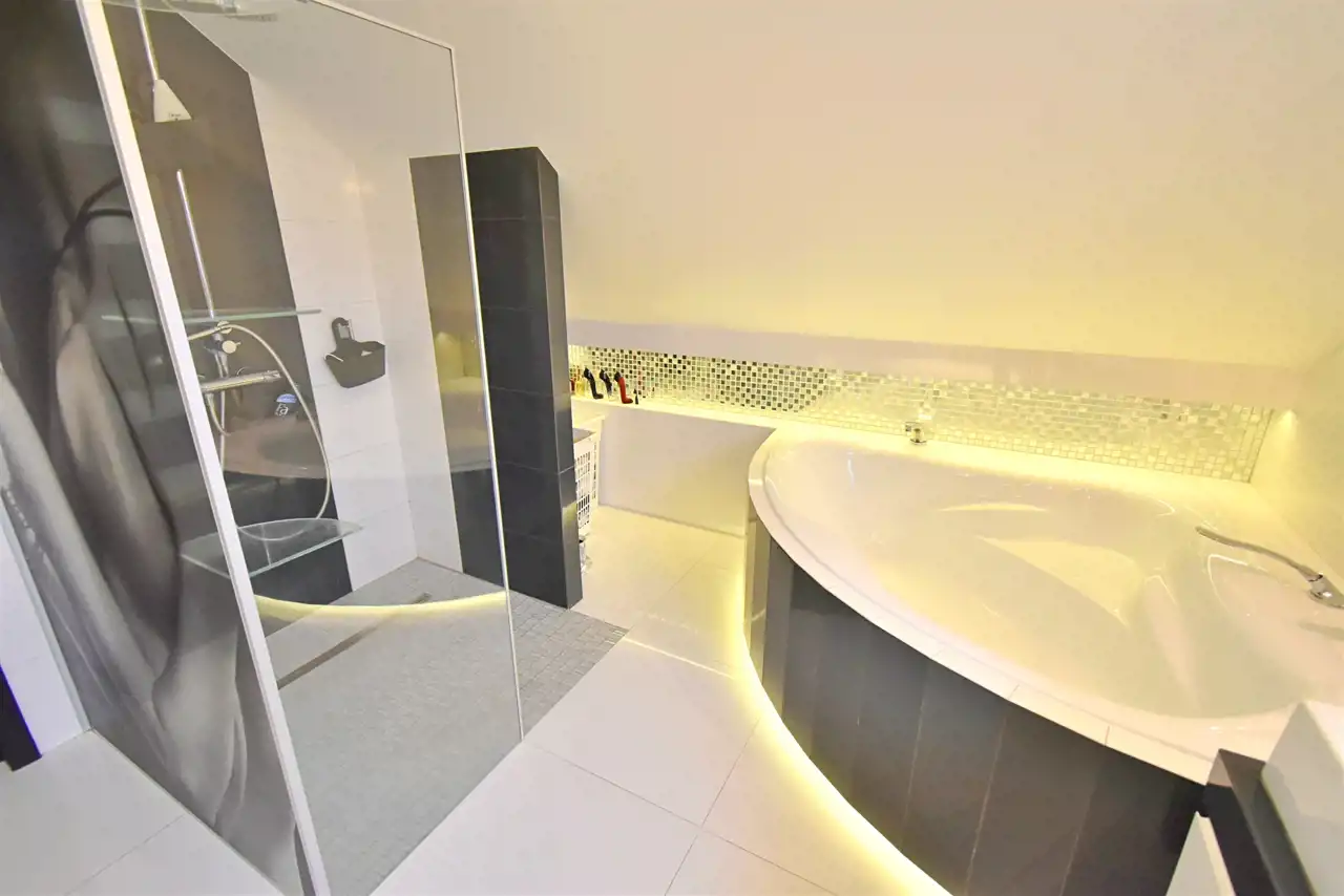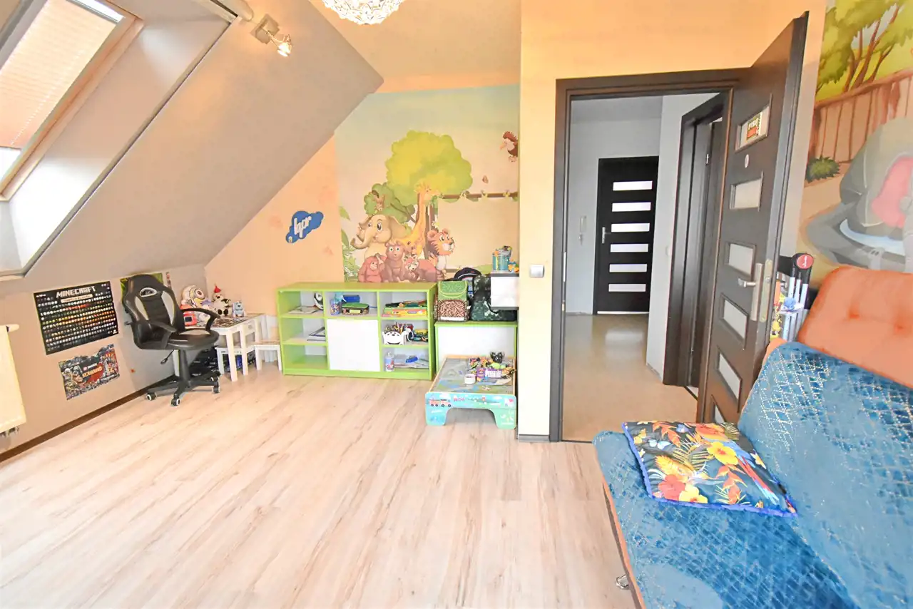 Na parterze znajduje się: pokój dzienny z jadalnią 28,20 m2, kuchnia 10,96 m2 , pokój 12,49m2, łazienka 3,38 m2, korytarz 3,12 m2, hol 8,20 m2, klatka schodowa 3,25 m2, piwnica 4,41 m2, garderoba 2,61 m2, garaż 20,48 m2, kotłownia 4,98 m2. Łącznie 102,08 m2. Na podłogach panele winylowe z ogrzewaniem podłogowym, w oknach rolety z napędem elektrycznym, w wykuszu grzejniki naścienne, wyjście z salonu na osłonięty taras zabudowany drewnem ze szkłem, z widokiem na przepięknie urządzony zarybiony staw z kaskadą oraz widokiem na ogród.