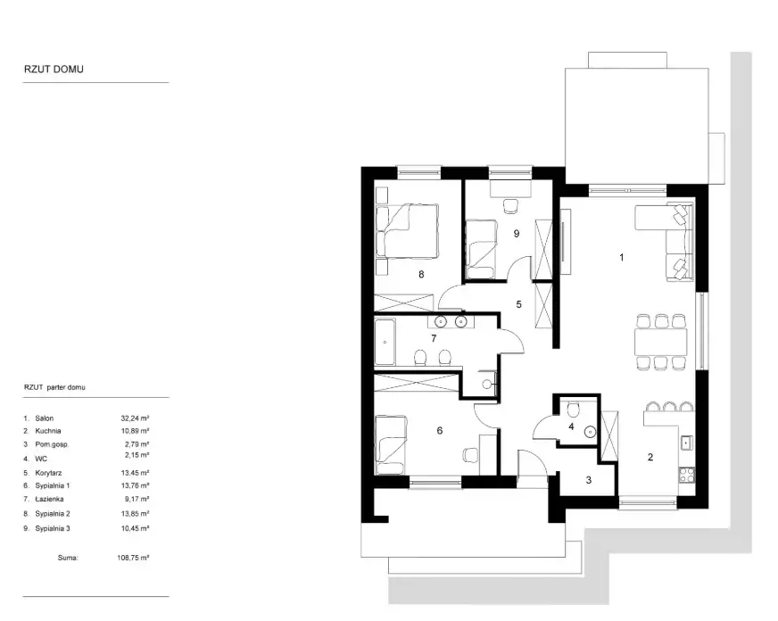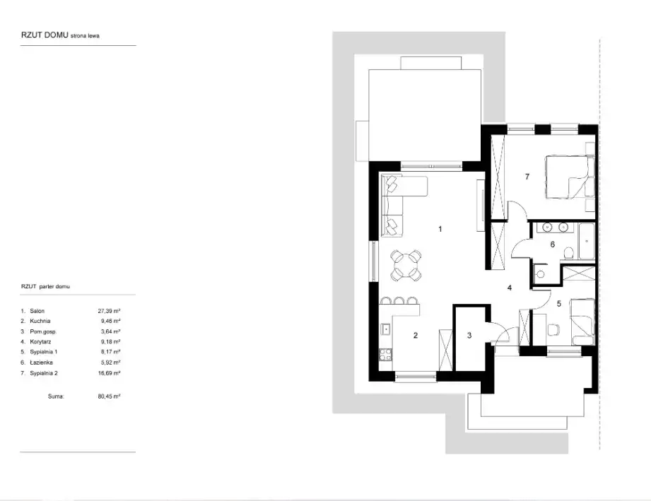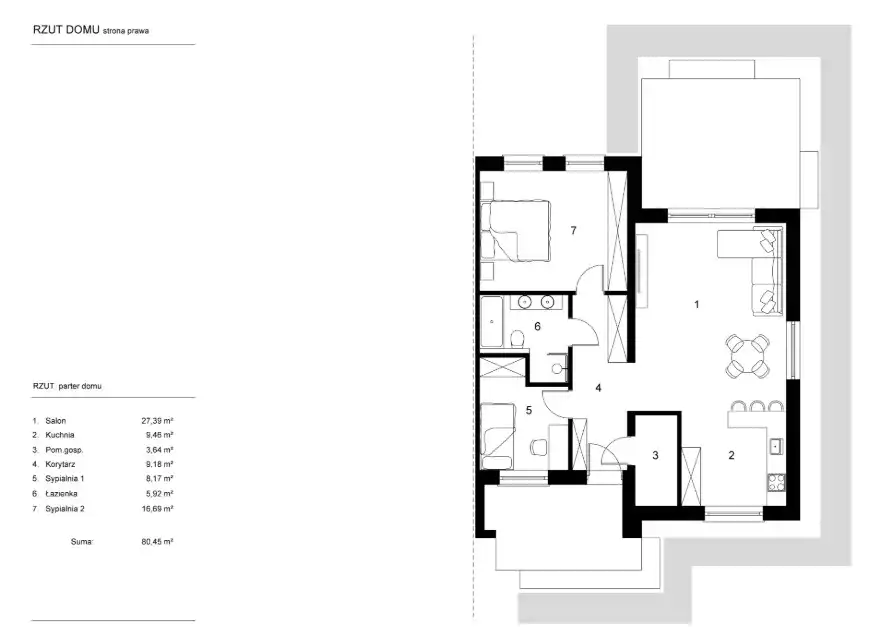 – salon z jadalnią 27,39 m² z wyjściem na taras