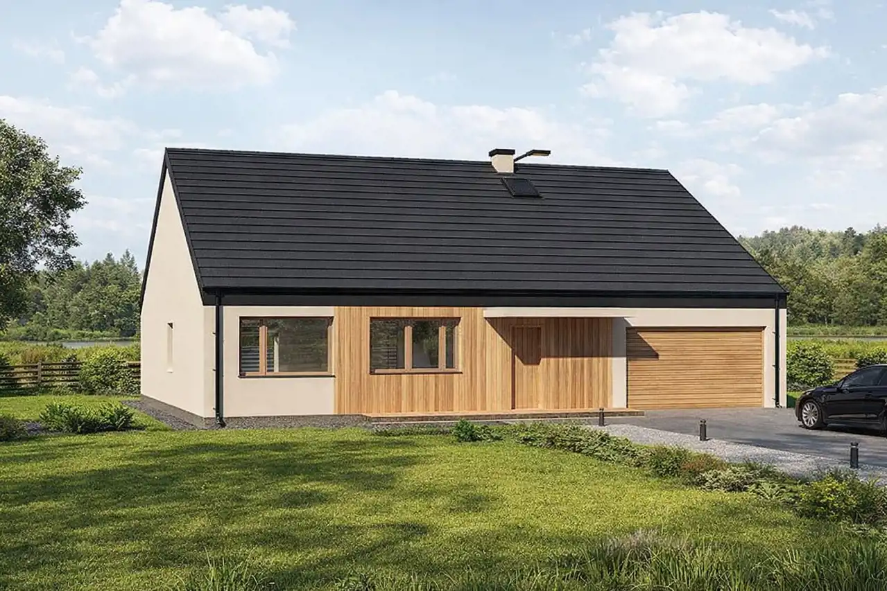 Dom zaprojektowano jako nowoczesny budynek parterowy z możliwością adaptacji poddasza, o funkcjonalnym układzie pomieszczeń oraz dużych przeszkleniach od strony ogrodu. Charakterystycznym elementem projektu jest przeszklona ściana ogrodowa, która naturalnie łączy wnętrze domu z otaczającą przyrodą.