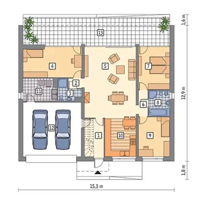 Dom zaprojektowano w sposób zapewniający maksymalną funkcjonalność i wygodę życia dla 4–5 osobowej rodziny.
