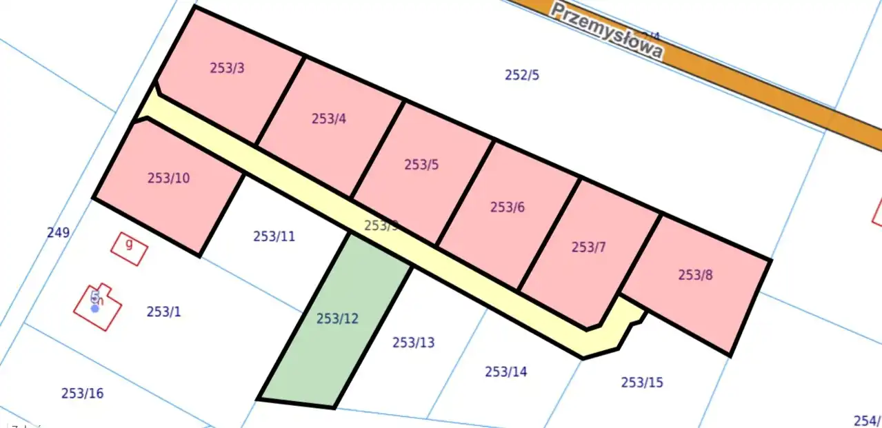 oznaczone na zielono w linii po lewej od drogi wewnętrznej - dostępne, oznaczone na czerwono - sprzedane)