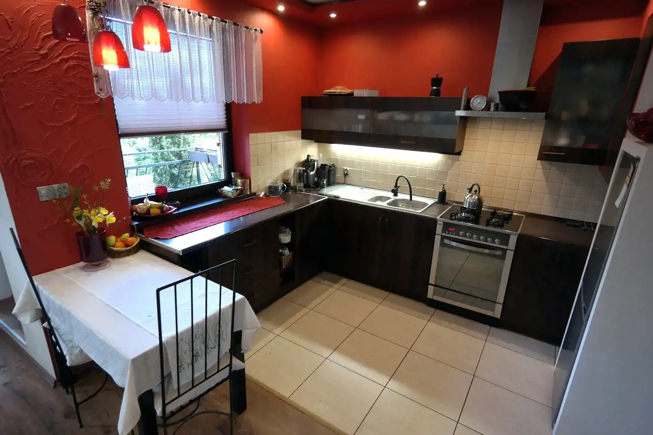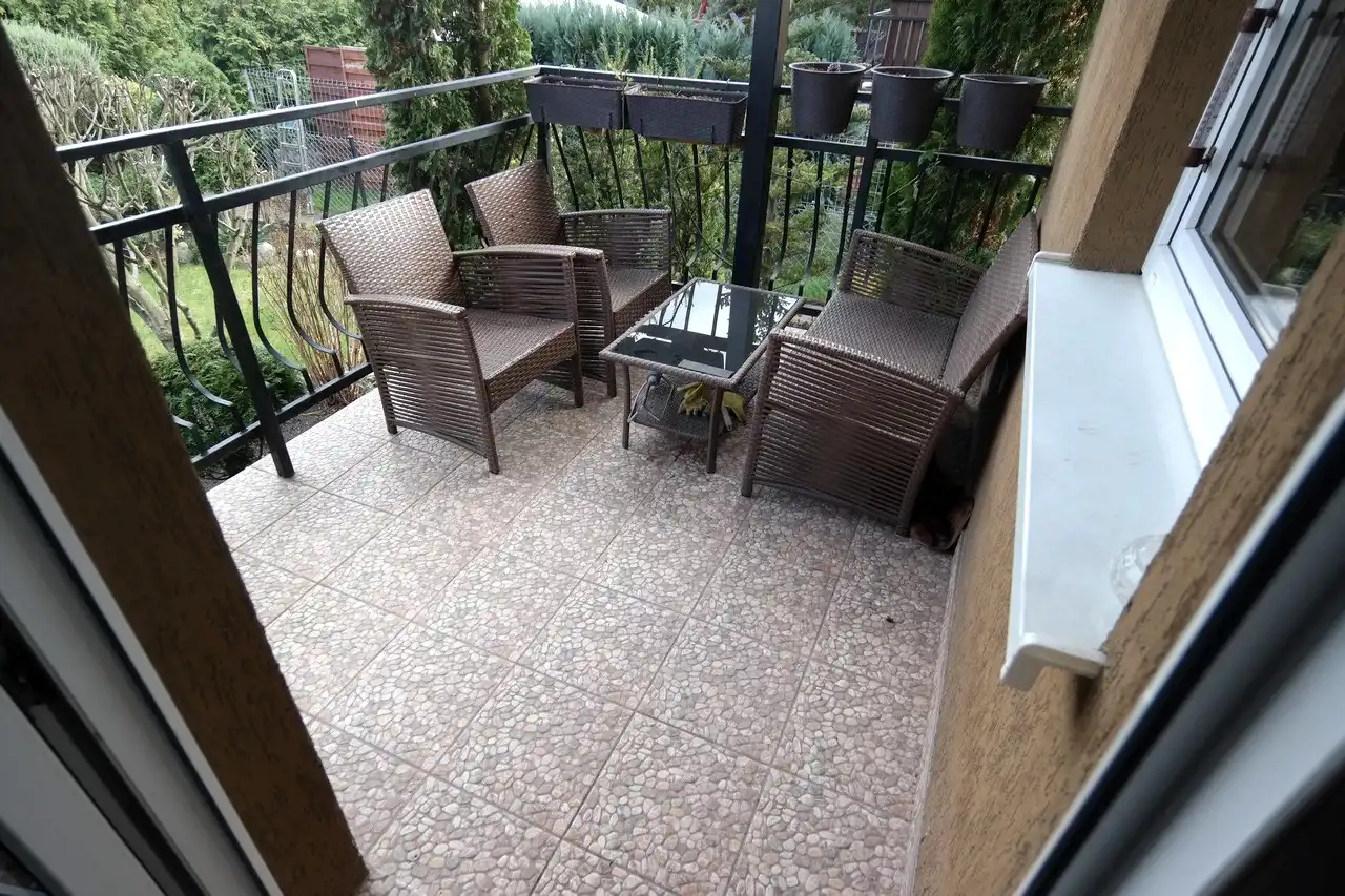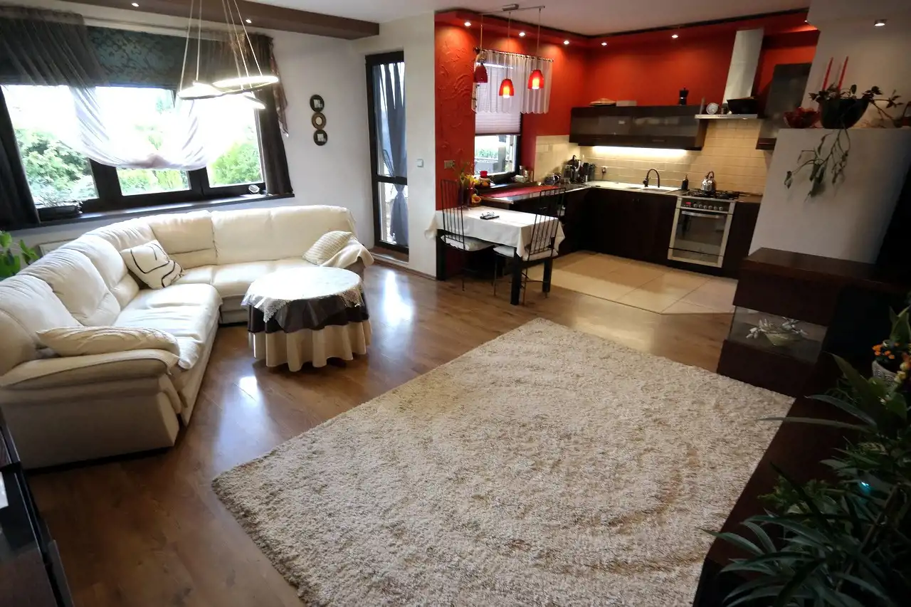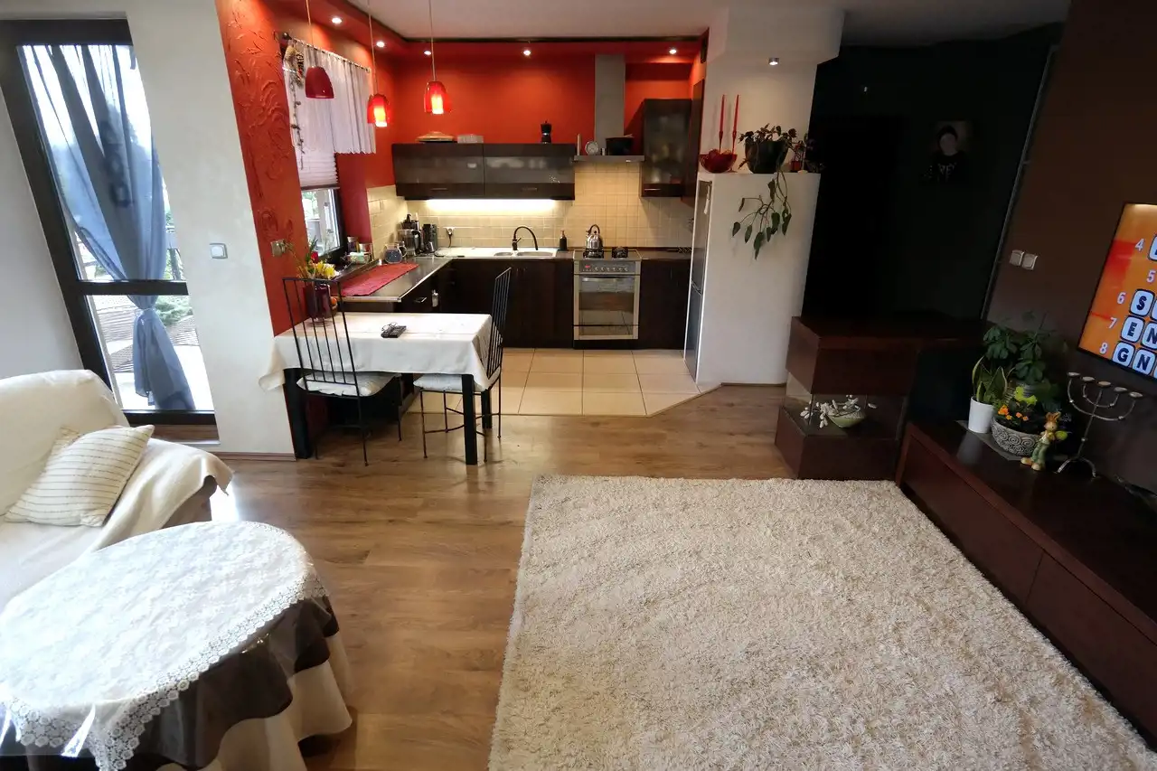 Mieszkanie po remoncie. Z dużym potencjałem. Duży balkon z widokiem na ogródek. Zejście bezpośrednio na ogródek. W pokojach panele na podłodze. Gładzie na ścianach. Rolety i moskitiery w oknach. Dwie łazienki. W łazience kafelki na podłodze i ścianach. Kabina i wanna WC. W przedpokoju panele i gładzie. Szafa typu komandor. Garderoba w pokoju. Drzwi antywłamaniowe. Aneks kuchenny. Kafelki, gładzie. Płyta gazowa, okap, piekarnik elektryczny, lodówka, m.in. Amica i Sharp. Piec gazowy dwu funkcyjny. Duży salon z aneksem i wyjściem na taras. Kominek elektryczny w pokoju na dole. 2 sypialnie. 1 pokój otwarty. Pod domem garaż, pomieszczenie gospodarcze, pokój i druga łazienka. Działka ok 200 m2 z ogródkiem 100 m2. Zabudowa łazienki i kuchni pozostaje. Reszta do negocjacji. Pięknie zagospodarowany ogródek !