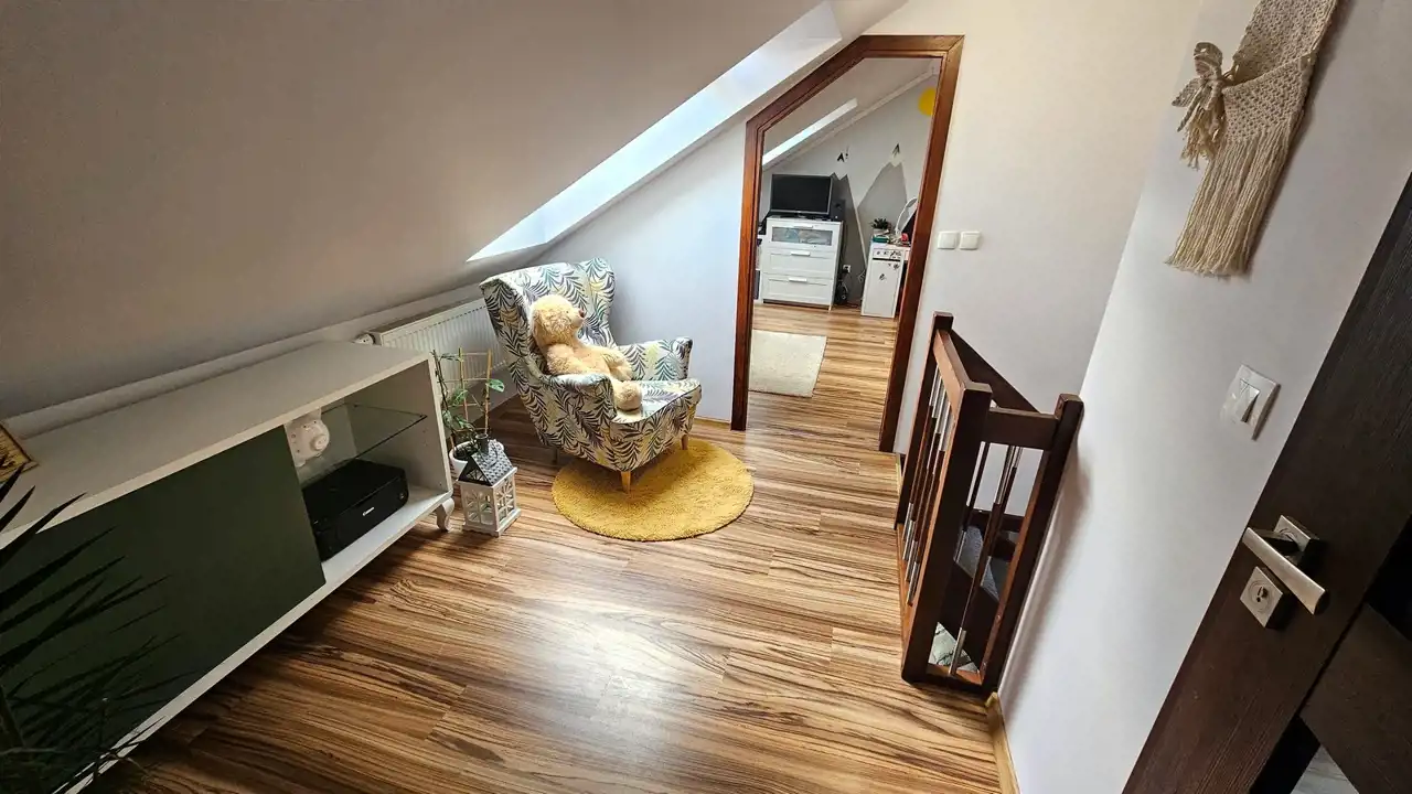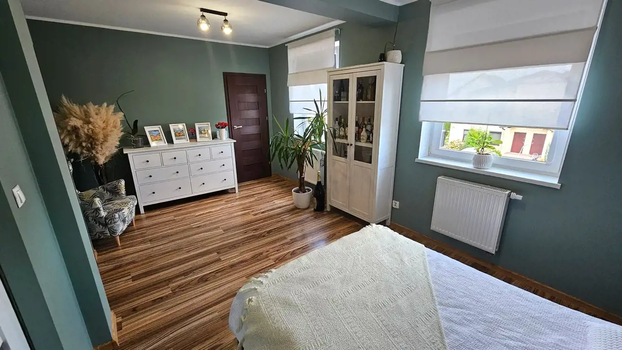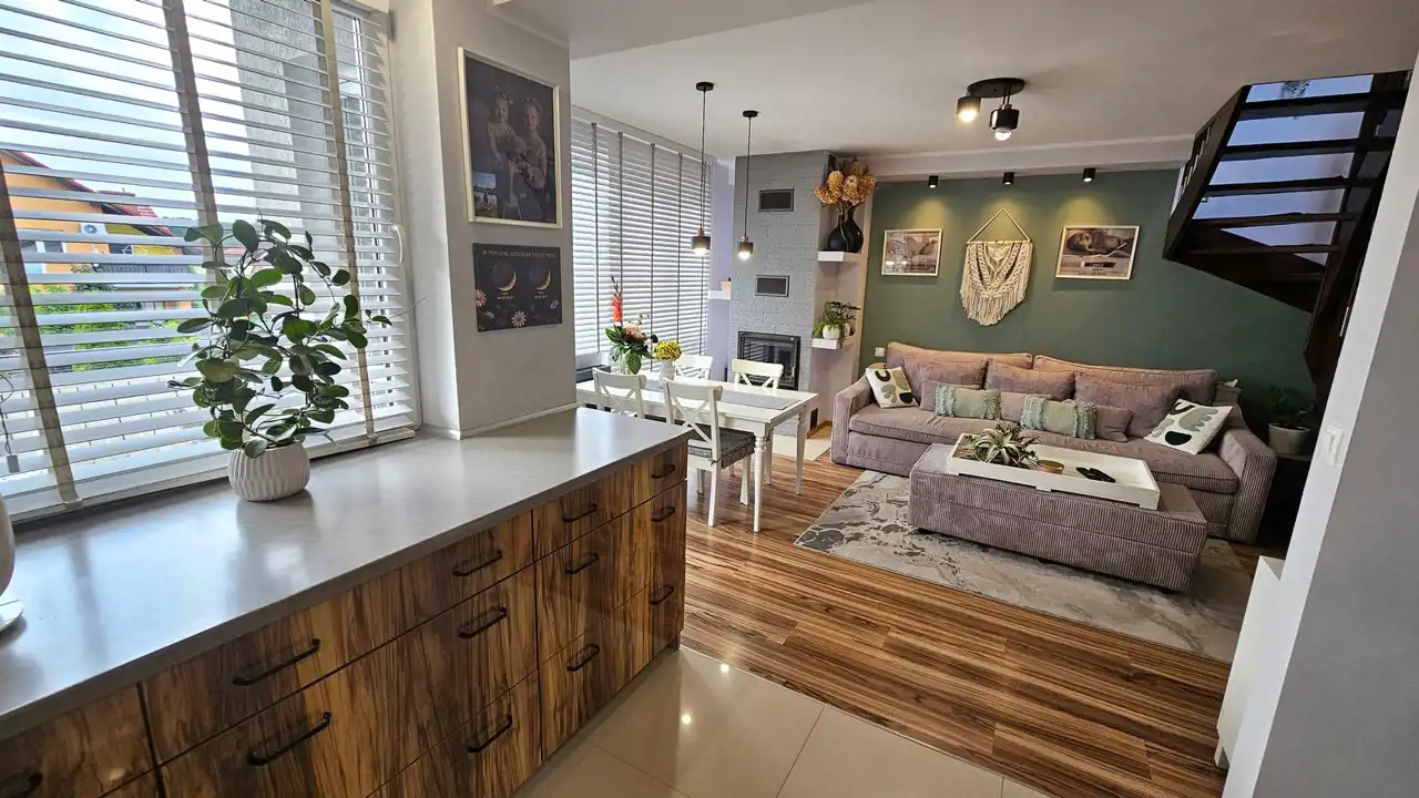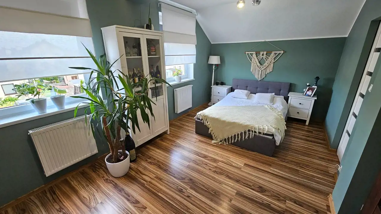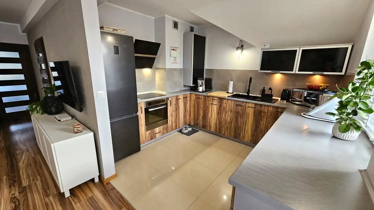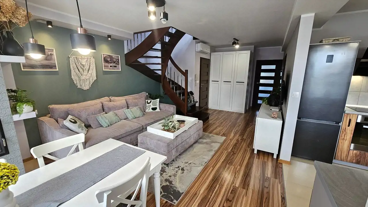 Nowe mieszkanie po remoncie. Z dużym potencjałem. Dwu poziomowe. Duży balkon z widokiem na ogródek. W pokojach panele wysokiej jakości na podłodze. Duża sypialnia z dwoma garderobami. Gładzie na ścianach. Duża łazienka. Kafelki na podłodze i ścianach. Kabina prysznicowa, duża wanna, WC. W przedpokoju gładzie i kafle. Okna PCV, moskitiery. Aneks kuchenny wraz z wyposażeniem pozostaje. Indukcja, piekarnik elektryczny, zmywarka, okap. Hot Point, Whirpool. Gres, gładzie. Duży salon z aneksem kuchennym i wyjściem na taras. Kominek w salonie. Na piętrze 2 sypialnie i łazienka. Pod domem garaż i pomieszczenie gospodarcze. Przed domem drewutnia. Działce zagospodarowana. Altana i huśtawka. Działka ok 500 m2 z ogródkiem 100 m2. Zabudowy łazienki i kuchni pozostają. Szafy typu komandor pozostają. Meble do uzgodnienia. Podwójna klimatyzacja. Panele fotowoltaiczne.