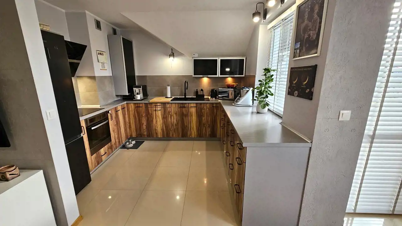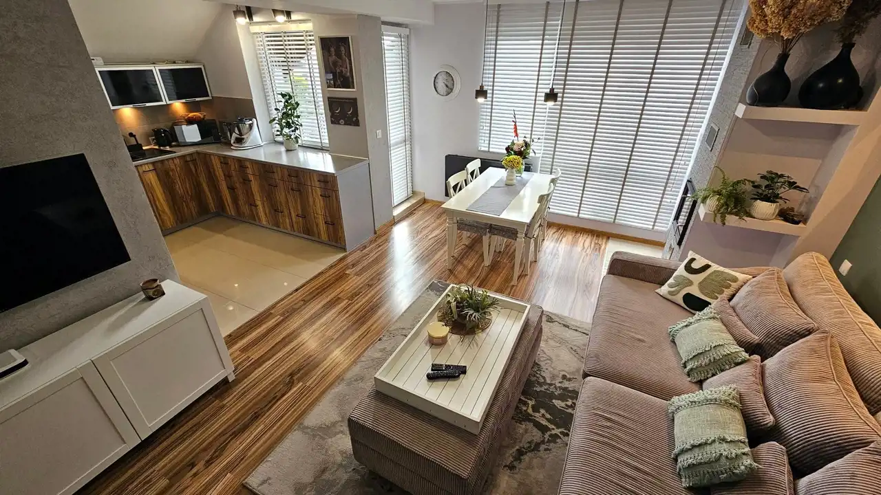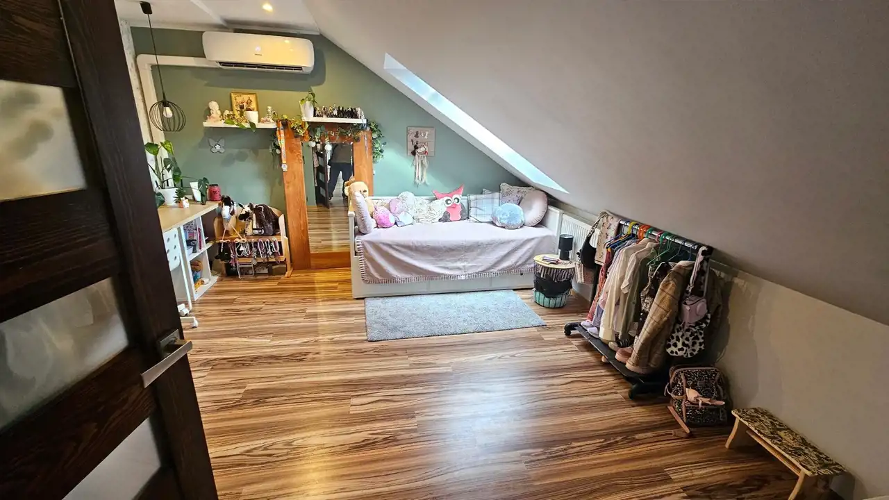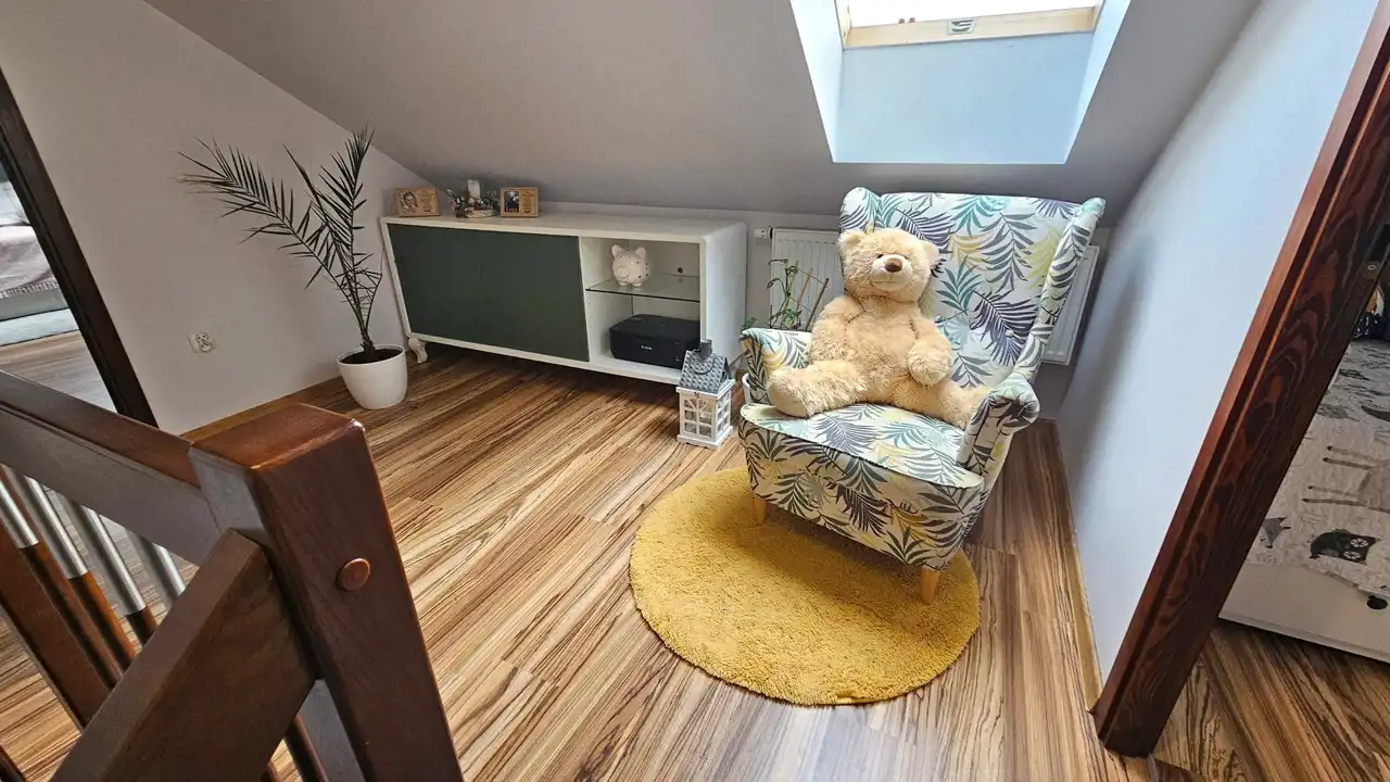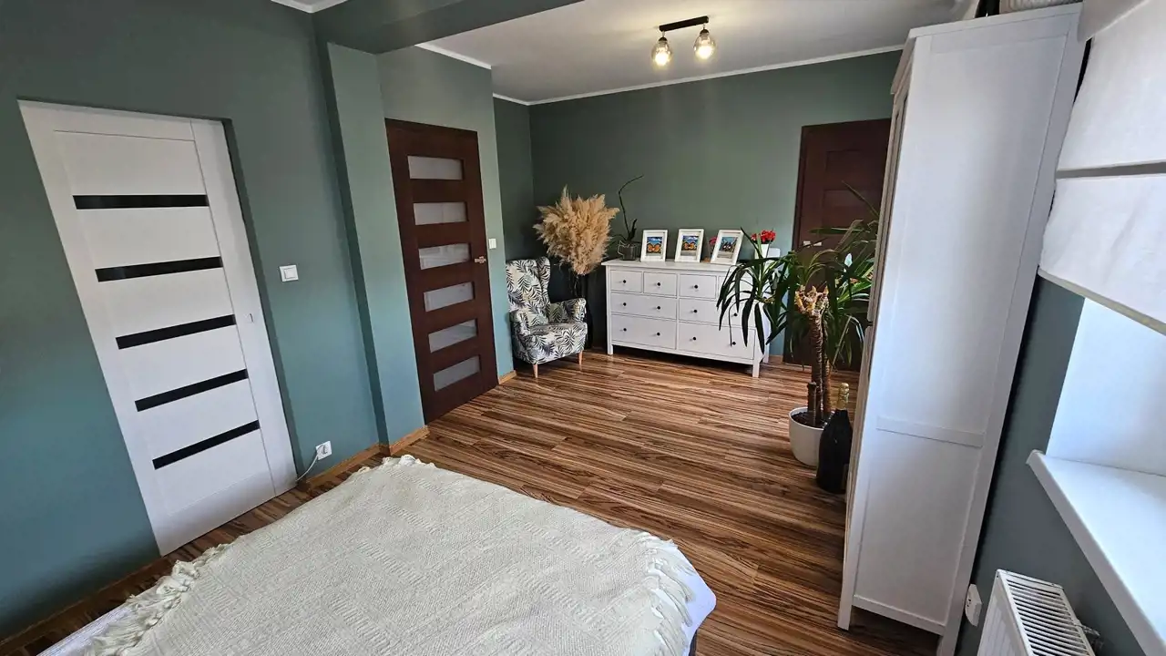 Nowe mieszkanie po remoncie. Z dużym potencjałem. Dwu poziomowe. Duży balkon z widokiem na ogródek. W pokojach panele wysokiej jakości na podłodze. Duża sypialnia z dwoma garderobami. Gładzie na ścianach. Duża łazienka. Kafelki na podłodze i ścianach. Kabina prysznicowa, duża wanna, WC. W przedpokoju gładzie i kafle. Okna PCV, moskitiery. Aneks kuchenny wraz z wyposażeniem pozostaje. Indukcja, piekarnik elektryczny, zmywarka, okap. Hot Point, Whirpool. Gres, gładzie. Duży salon z aneksem kuchennym i wyjściem na taras. Kominek w salonie. Na piętrze 2 sypialnie i łazienka. Pod domem garaż i pomieszczenie gospodarcze. Przed domem drewutnia. Działce zagospodarowana. Altana i huśtawka. Działka ok 500 m2 z ogródkiem 100 m2. Zabudowy łazienki i kuchni pozostają. Szafy typu komandor pozostają. Meble do uzgodnienia. Podwójna klimatyzacja. Panele fotowoltaiczne.