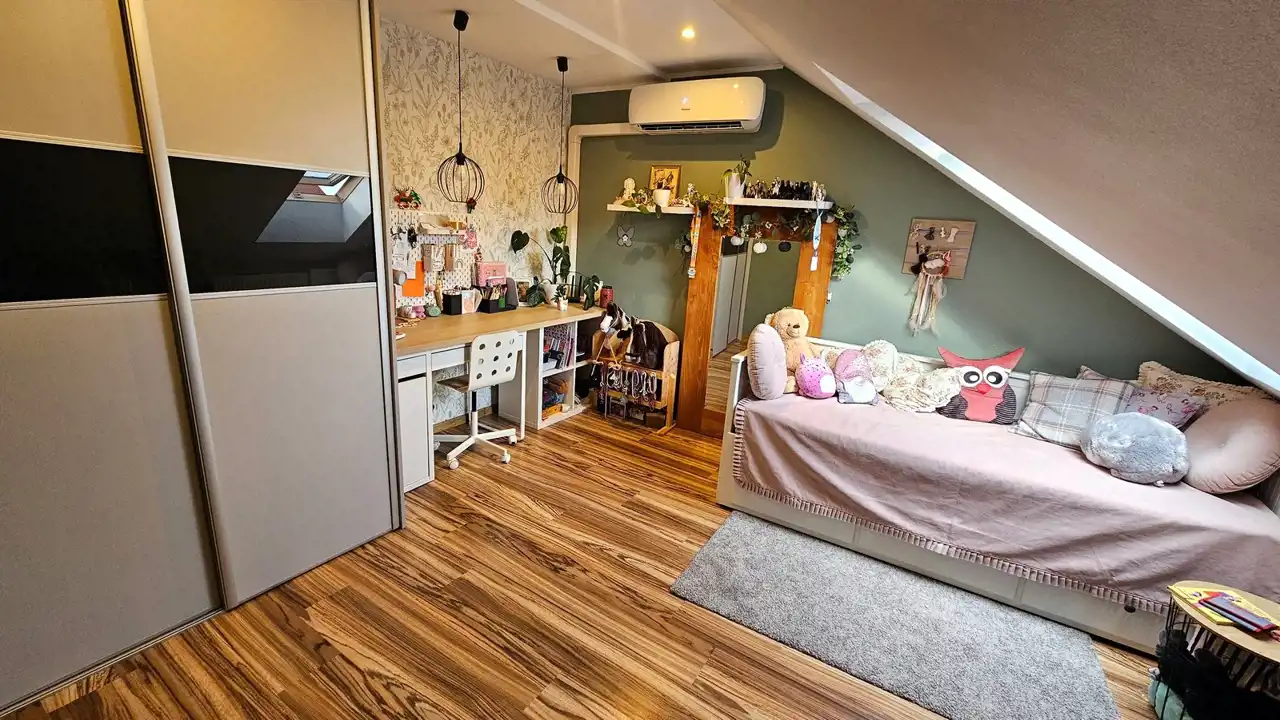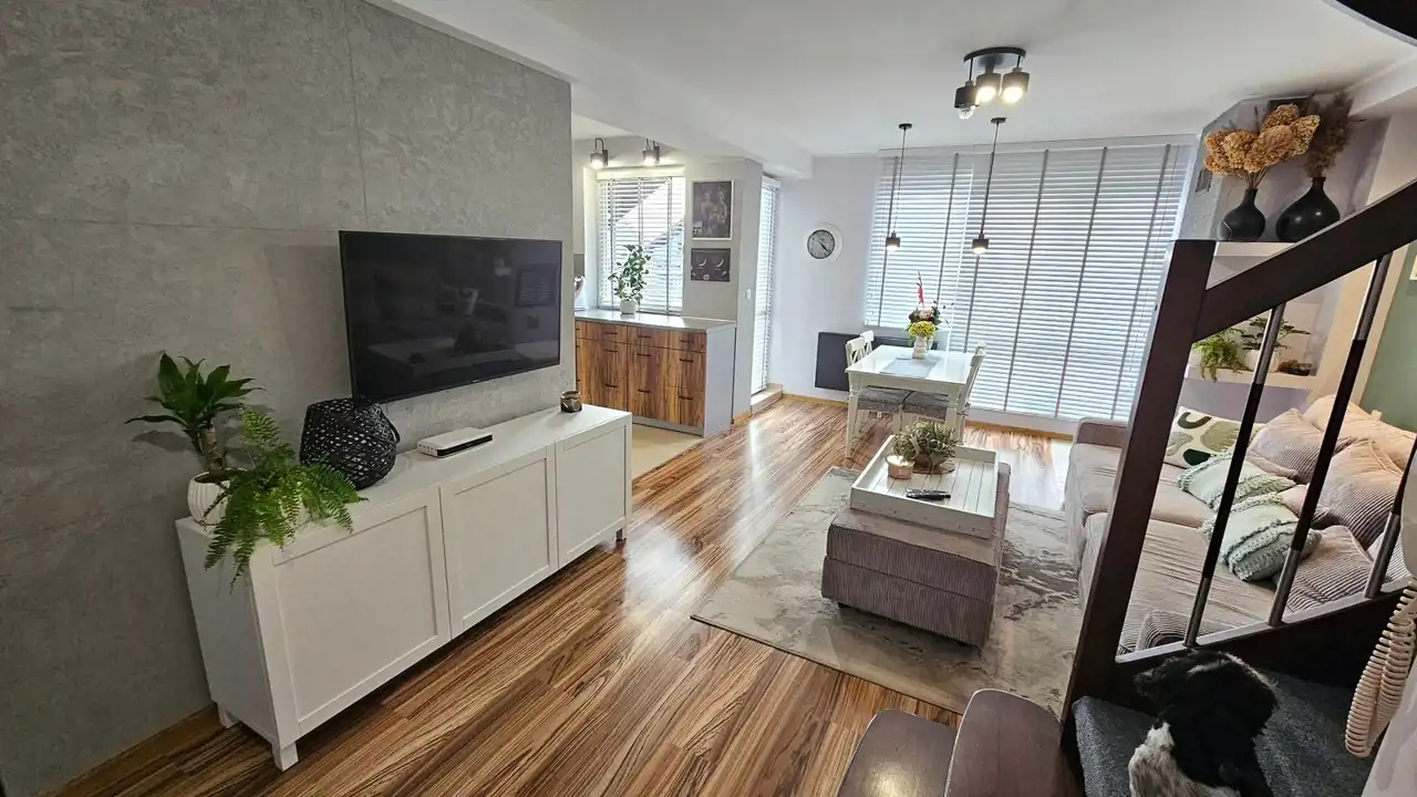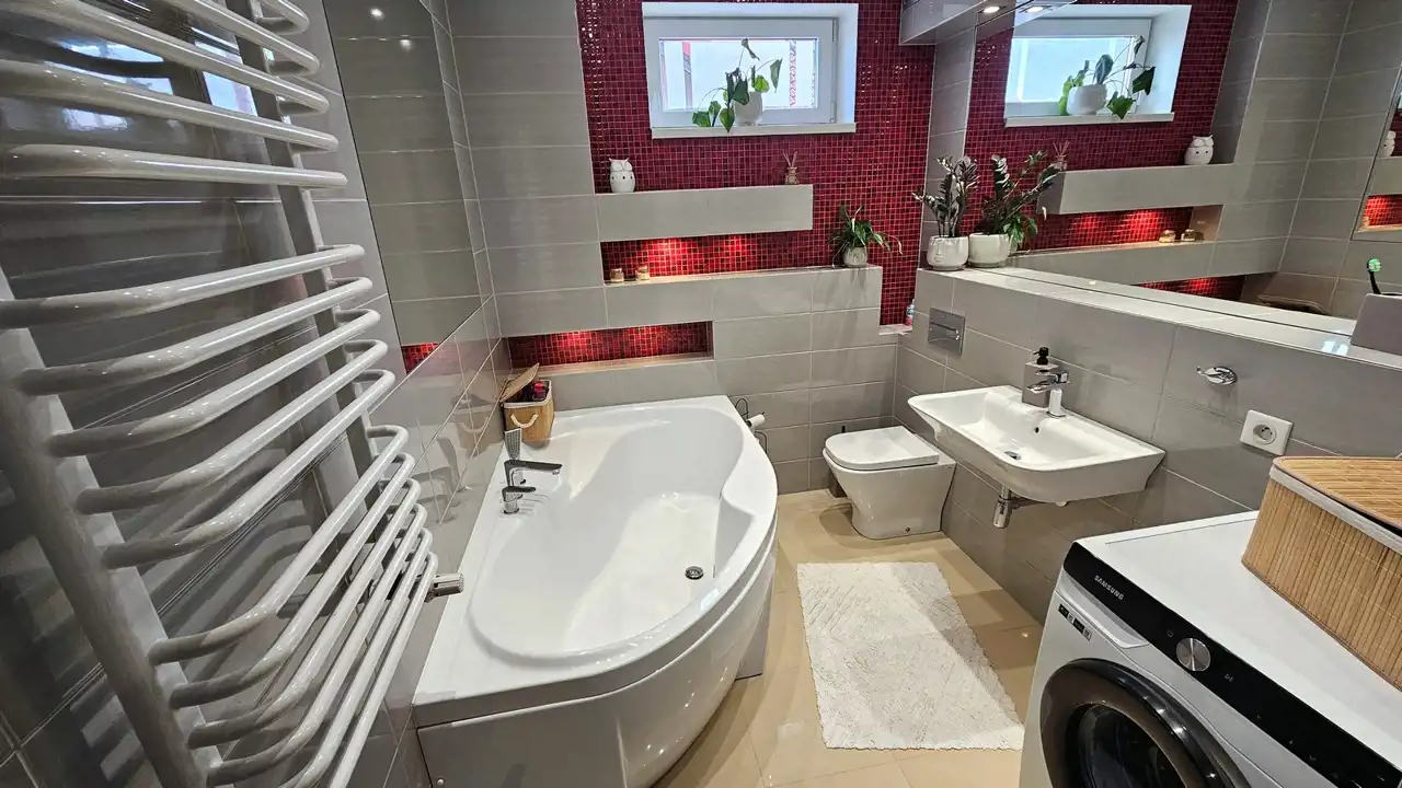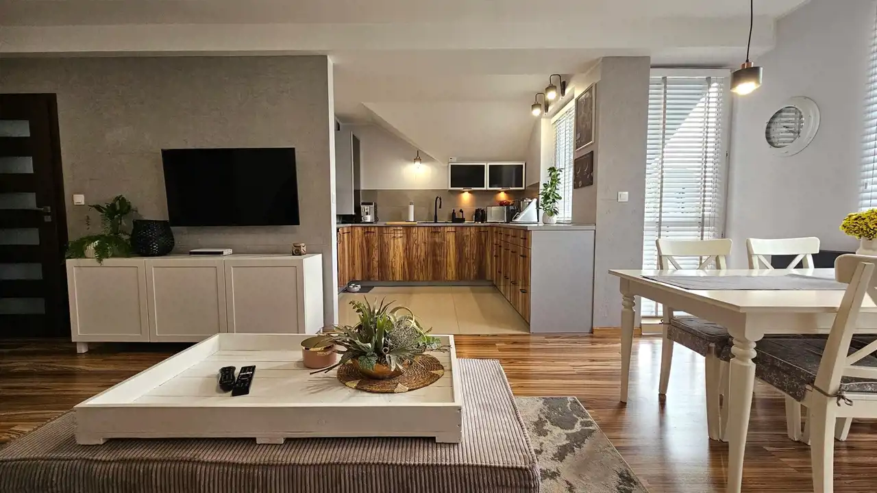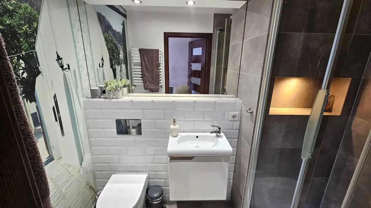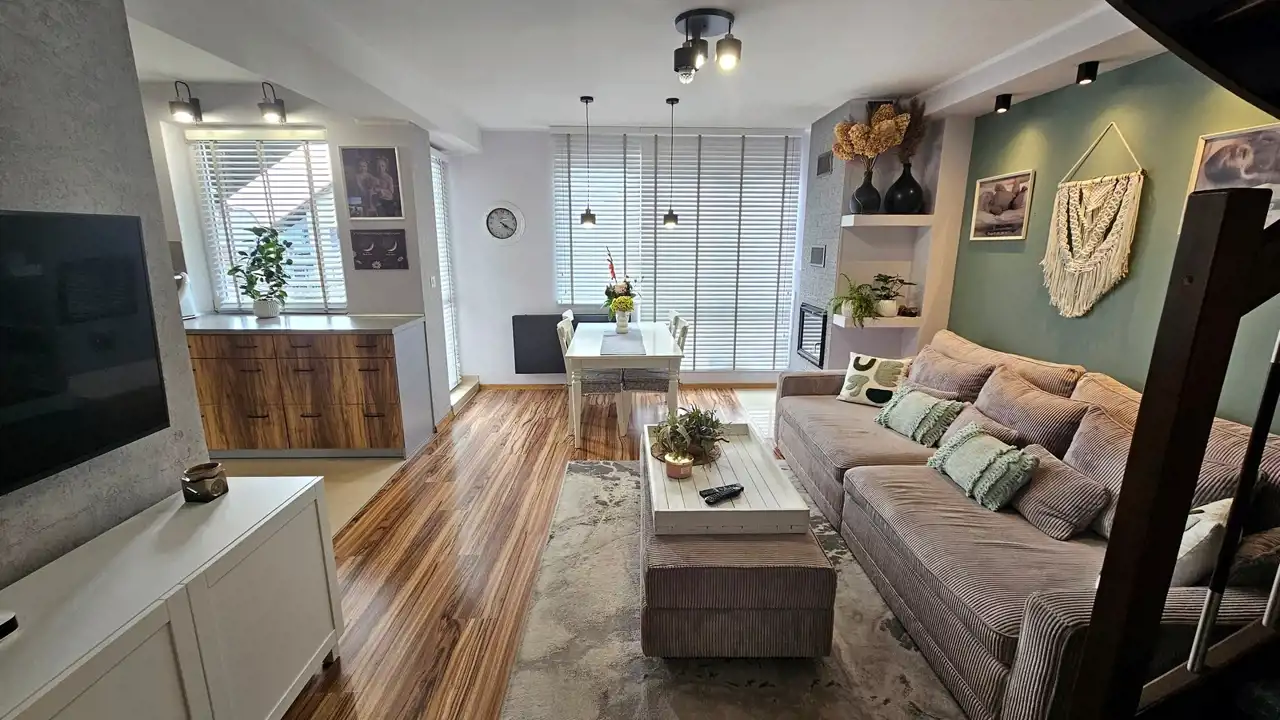 Nowe mieszkanie po remoncie. Z dużym potencjałem. Dwu poziomowe. Duży balkon z widokiem na ogródek. W pokojach panele wysokiej jakości na podłodze. Duża sypialnia z dwoma garderobami. Gładzie na ścianach. Duża łazienka. Kafelki na podłodze i ścianach. Kabina prysznicowa, duża wanna, WC. W przedpokoju gładzie i kafle. Okna PCV, moskitiery. Aneks kuchenny wraz z wyposażeniem pozostaje. Indukcja, piekarnik elektryczny, zmywarka, okap. Hot Point, Whirpool. Gres, gładzie. Duży salon z aneksem kuchennym i wyjściem na taras. Kominek w salonie. Na piętrze 2 sypialnie i łazienka. Pod domem garaż i pomieszczenie gospodarcze. Przed domem drewutnia. Działce zagospodarowana. Altana i huśtawka. Działka ok 500 m2 z ogródkiem 100 m2. Zabudowy łazienki i kuchni pozostają. Szafy typu komandor pozostają. Meble do uzgodnienia. Podwójna klimatyzacja. Panele fotowoltaiczne.