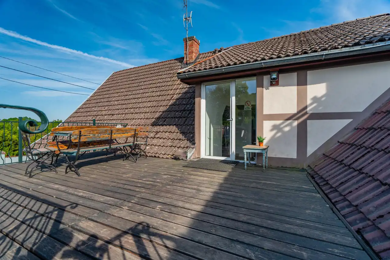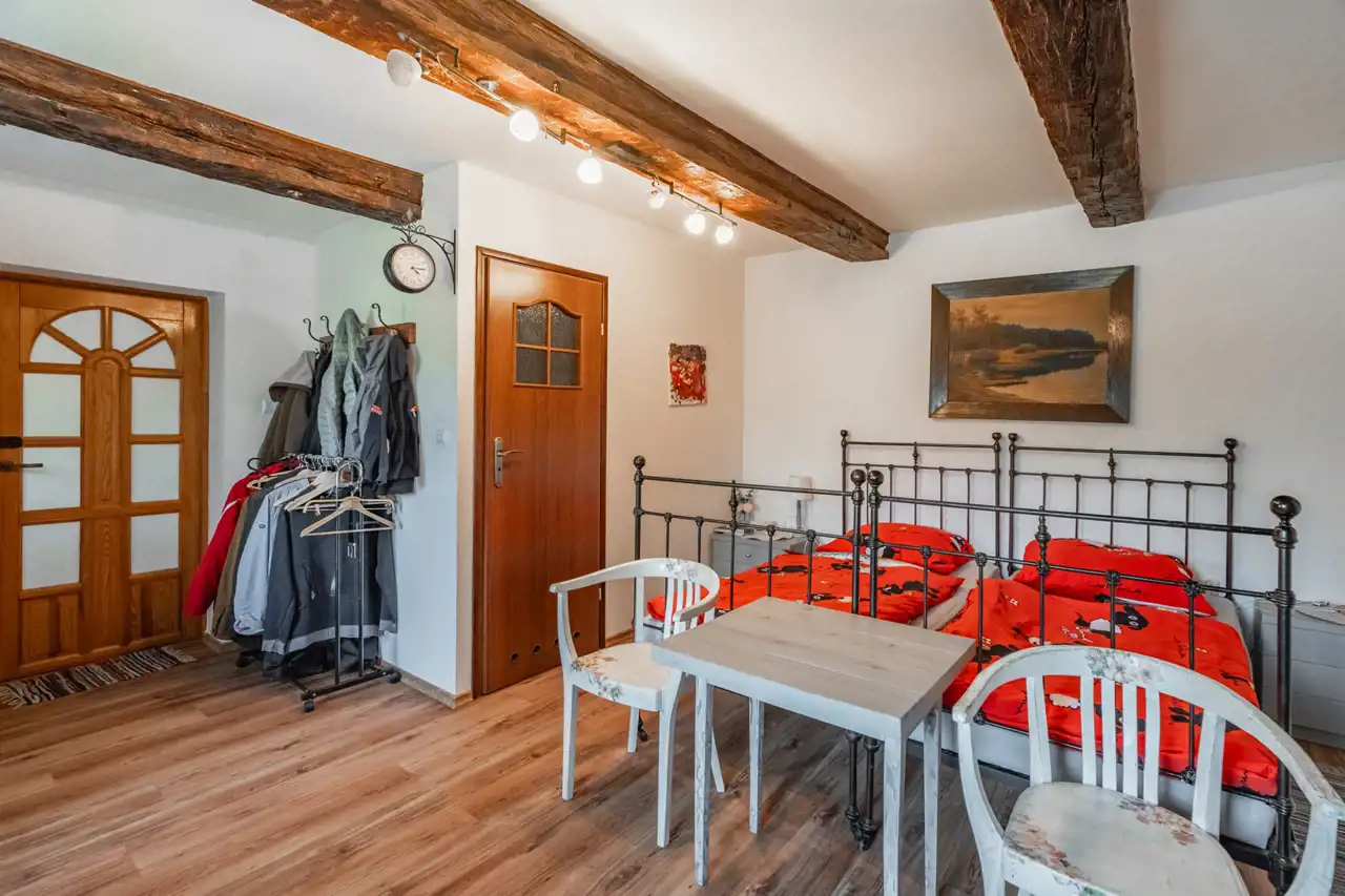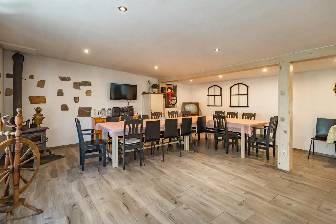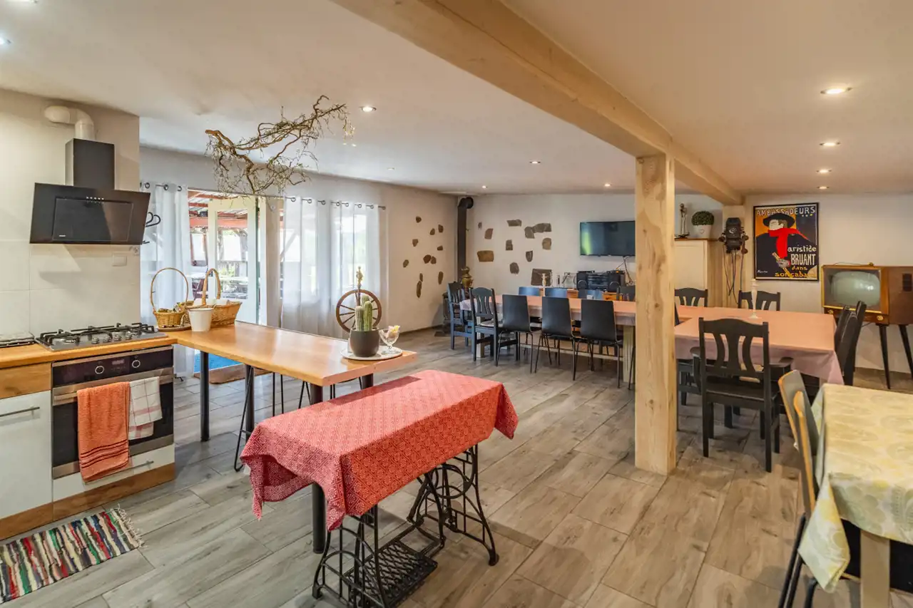 W skład nieruchomości wchodzi również budynek z przeznaczeniem na organizacje przyjęć okolicznościowych na około 30 osób z kuchnia, łazienką i zadaszonym miejscem na zewnątrz.