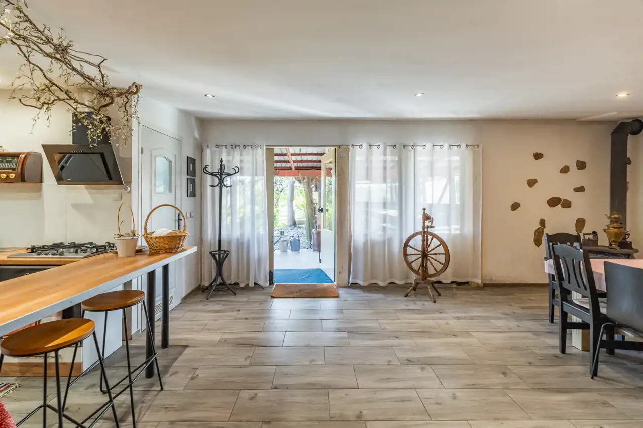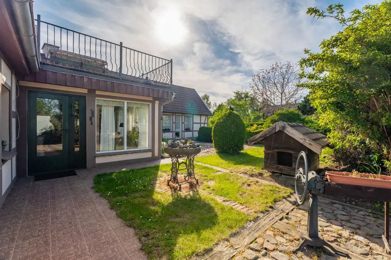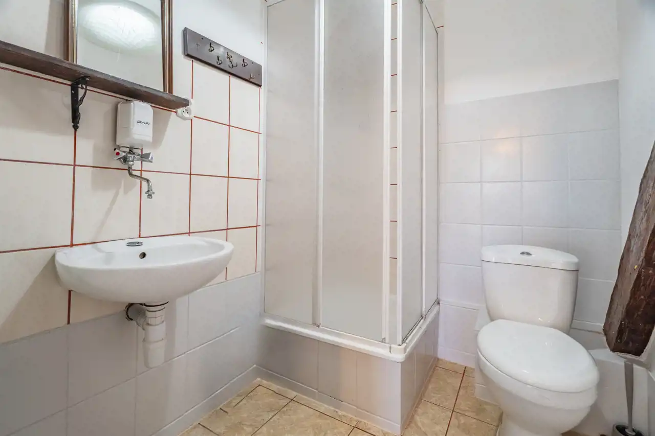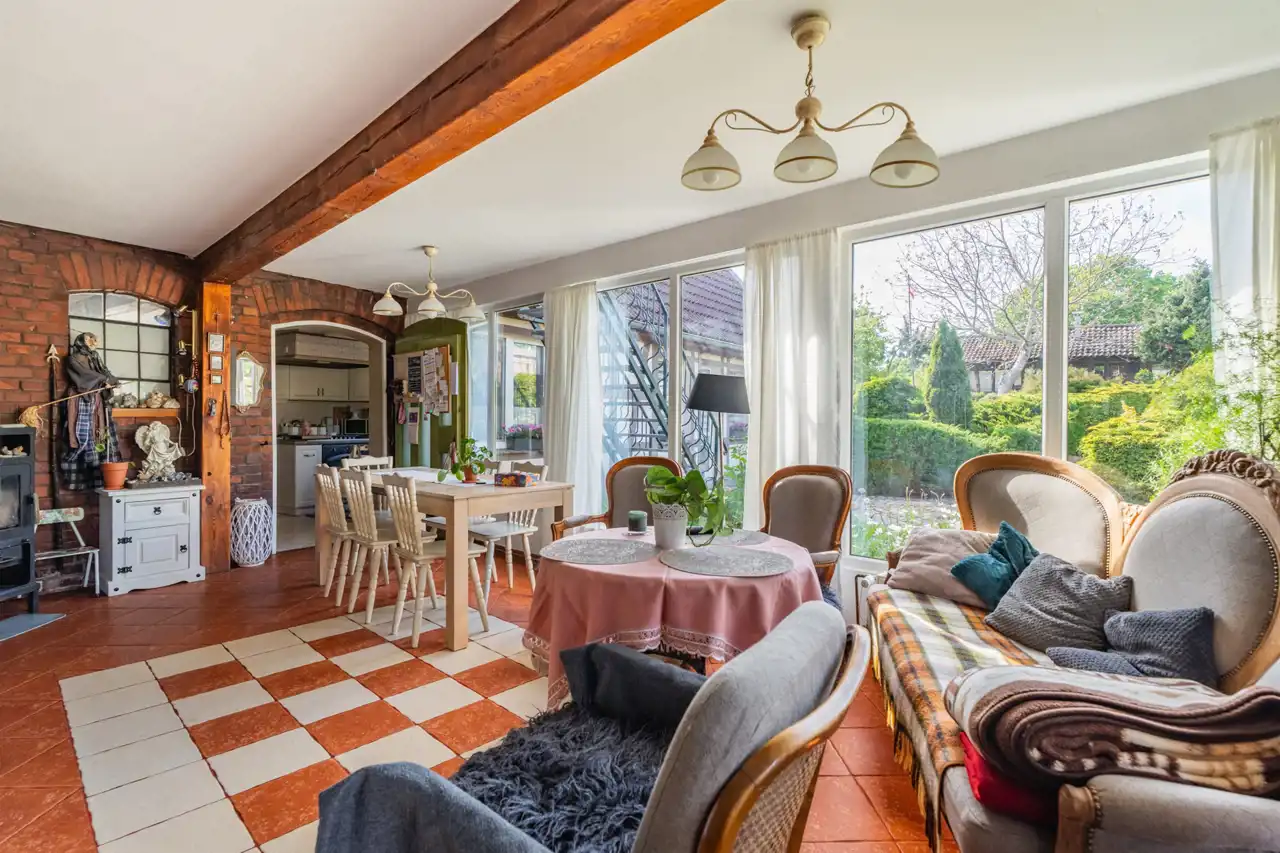 W skład nieruchomości wchodzi również budynek z przeznaczeniem na organizacje przyjęć okolicznościowych na około 30 osób z kuchnia, łazienką i zadaszonym miejscem na zewnątrz.